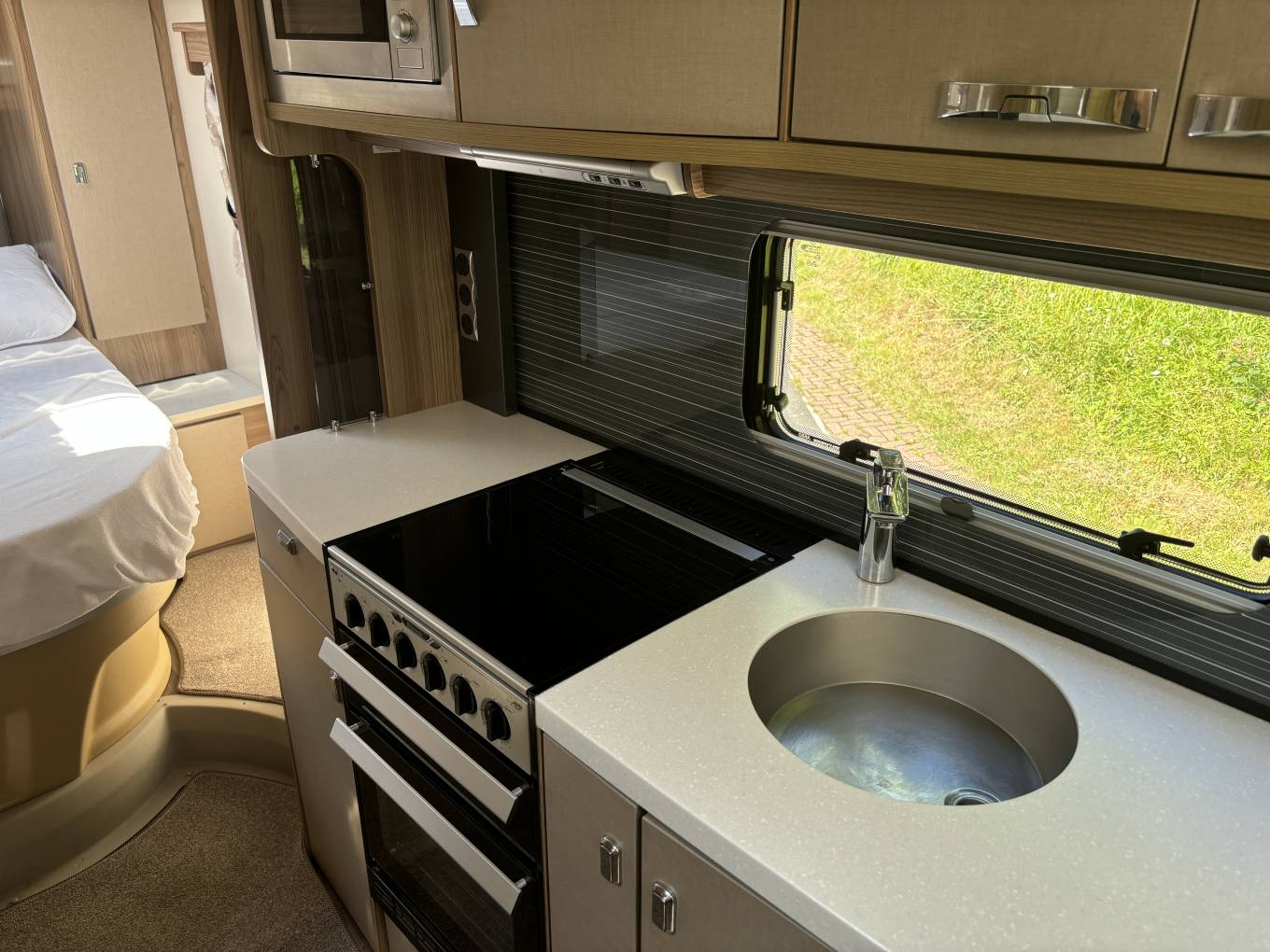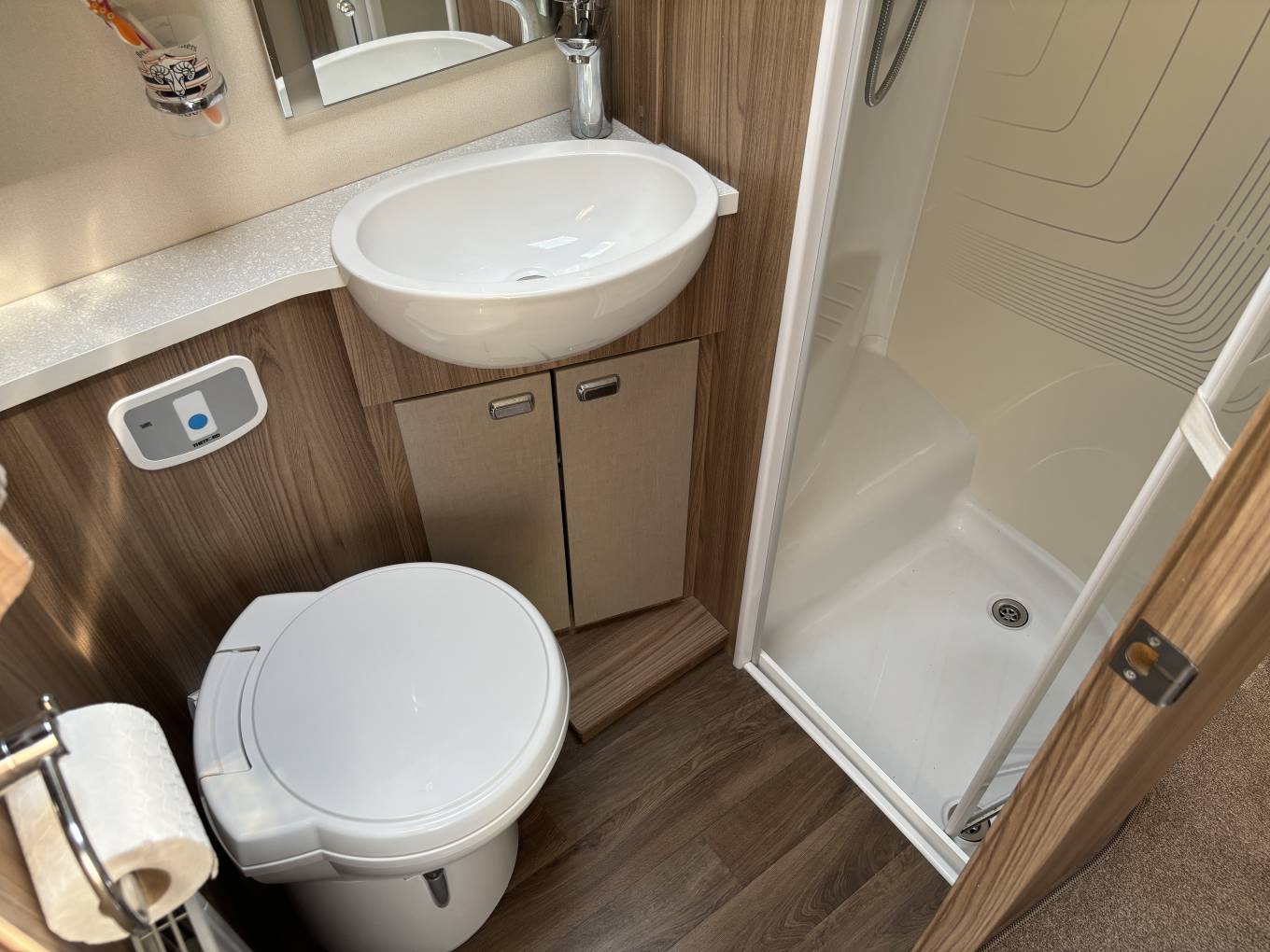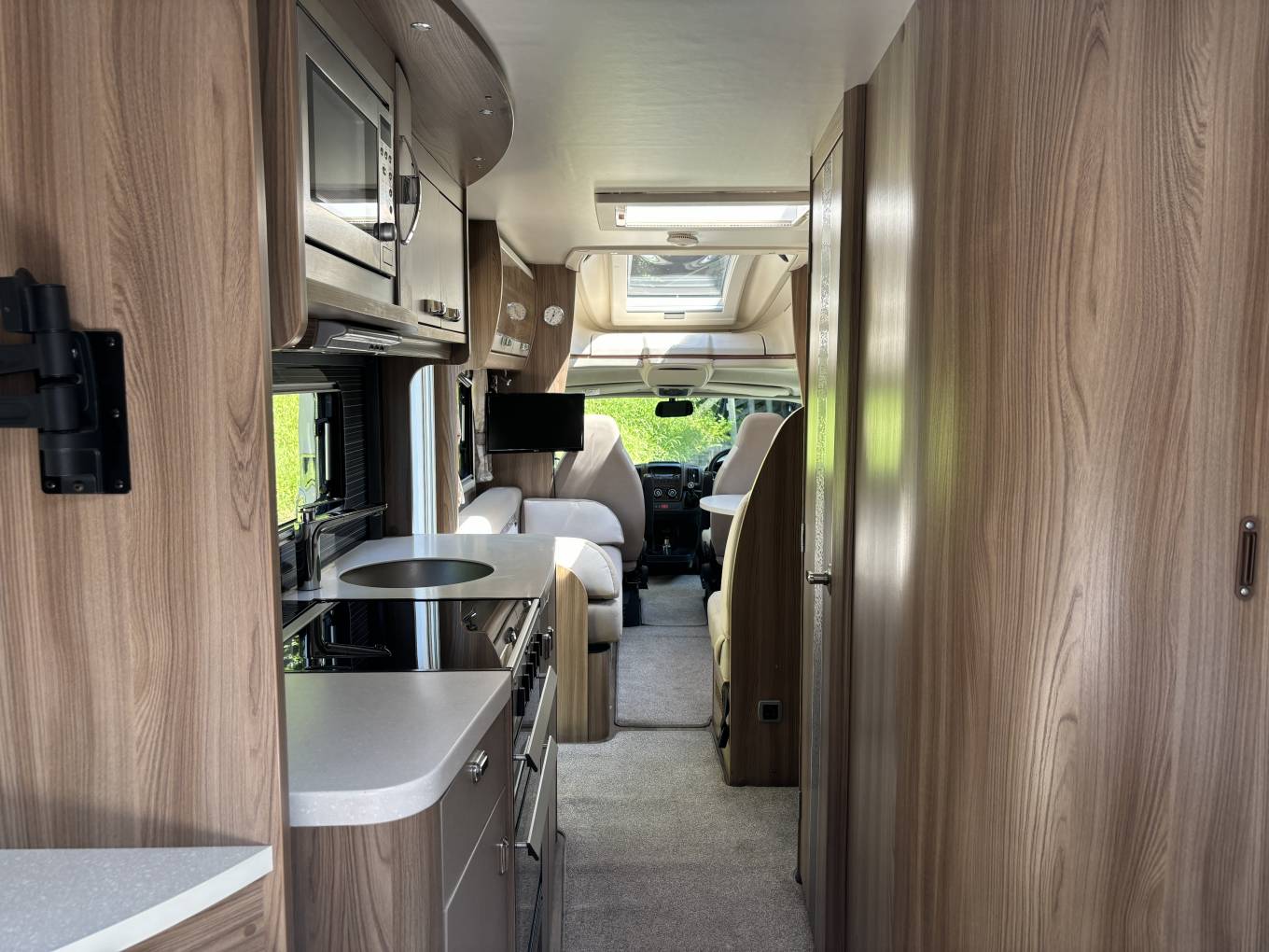 As you would expect from a Kon-Tiki the inside is spacious, with a fixed double bed at the rear and a fully equipped kitchen in the centre with sink, 4 hobs, oven, grill, microwave and fridge freezer. The central washroom has a toilet, sink and separate shower and the whole habitation area is heated using the fantastic Alde heating system which creates a wonderfully cosy environment.