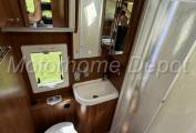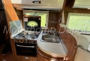 The kitchen consists of: L Shaped worktop with oblong stainless steel sink & draining board with chrome mixer tap; 3 gas burner hob over a good sized oven & grill with 12v extractor above. Under the counter are ample drawers & cupboards for all your kitchen utensils. Opposite a Dometic absorber fridge freezer that is fully automatic and will run on 240v, 12v, or gas depending on whether you are plugged in on site or wild camping.