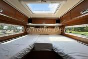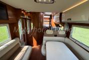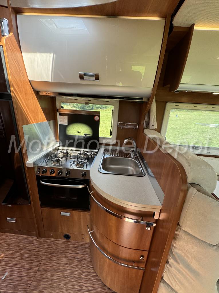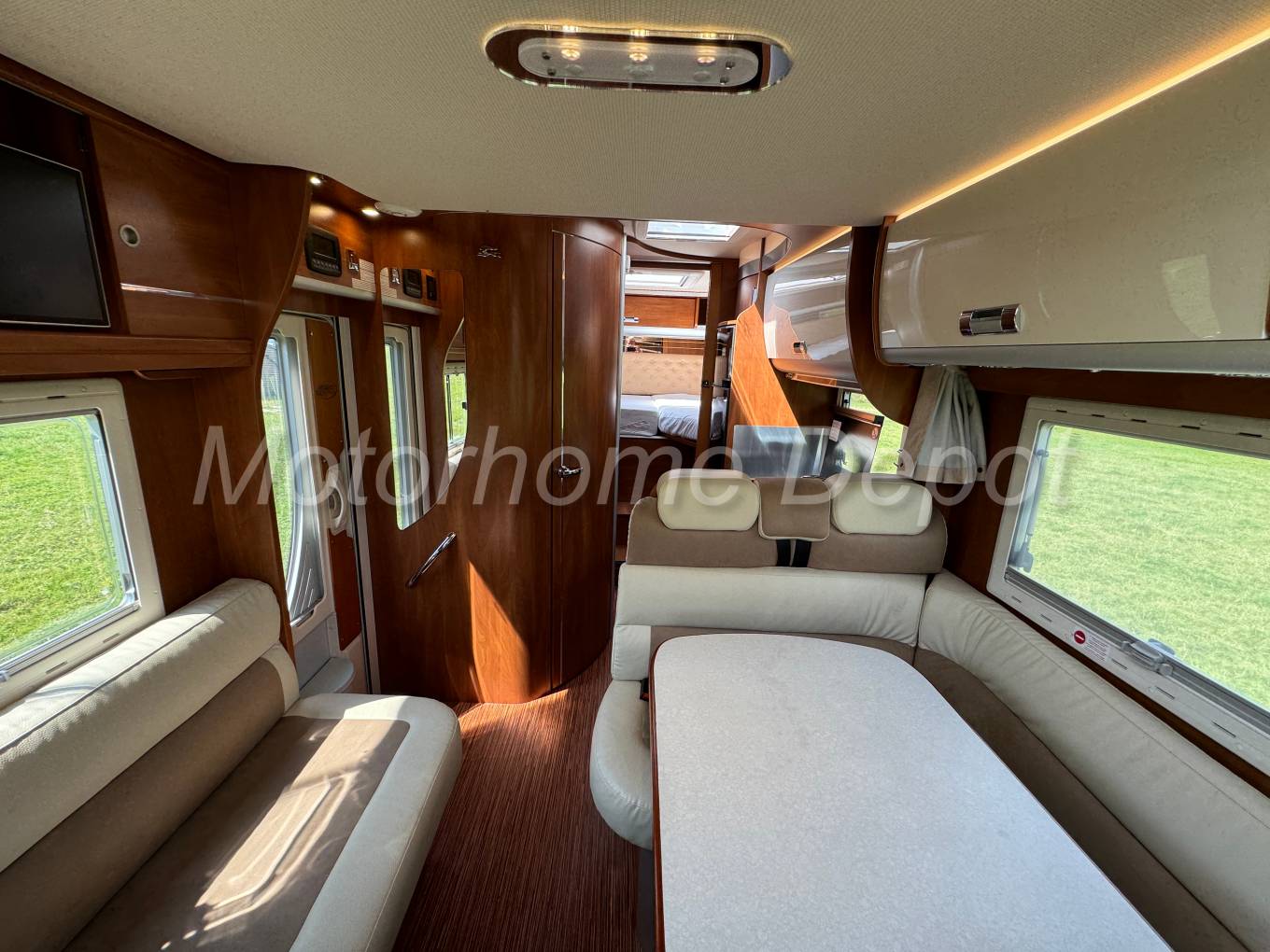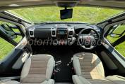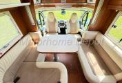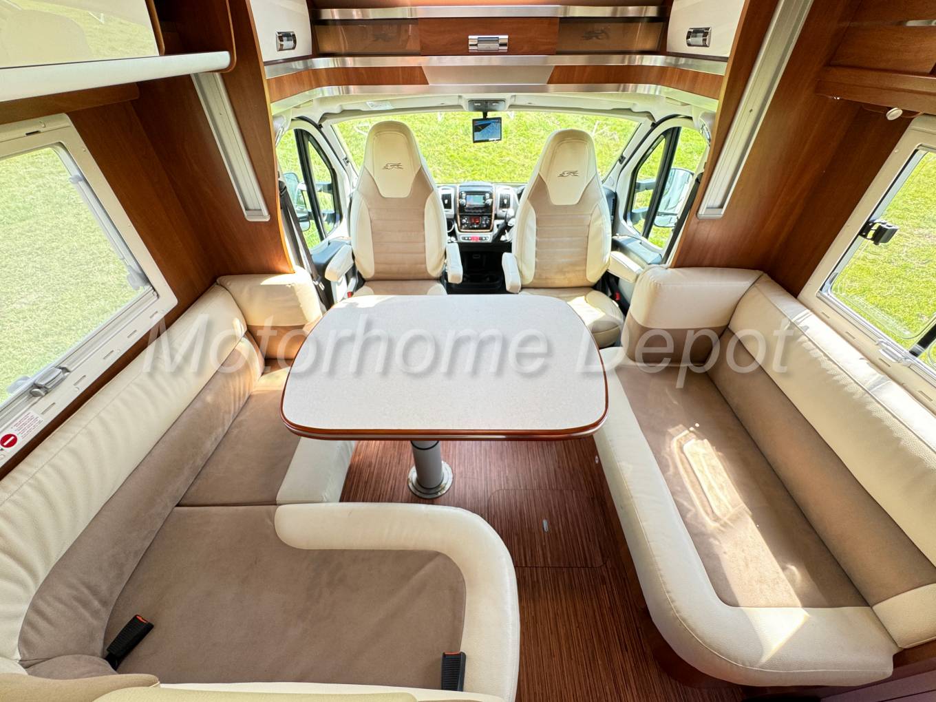We enter the motorhome on the drivers side via electric step immediately to the right is the dinette with a large L shaped sofa opposite, the forward facing part has 2 x 3 point seat belts for the 2 travelling guests. A single sofa just to the right of the habitation door. The front two seats also rotate to join this area so you could easily seat 6 if entertaining on site. The dining table can move in a fore and aft direction, but will also drop down to make up the occasional extra berth if required with the use of an infill cushion. There is a TV point flatscreen tv above the single sofa.