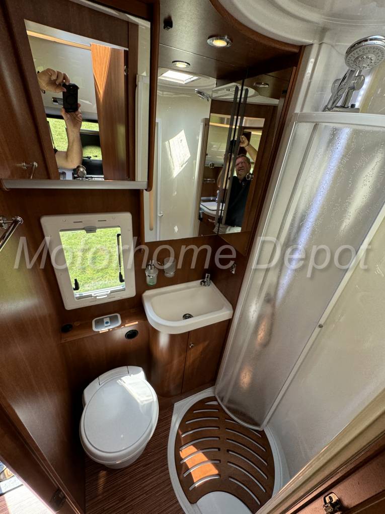 The Bathroom an all in one style but with separate shower cubicle with Perspex doors to close & wooden duck board. The toilet a cassette style electric fresh water flush unit with swivel top. Above is a white corner sink with chrome mixer tap. The bathroom is well lit with plenty of cupboards and mirrors to give a good sense of space.