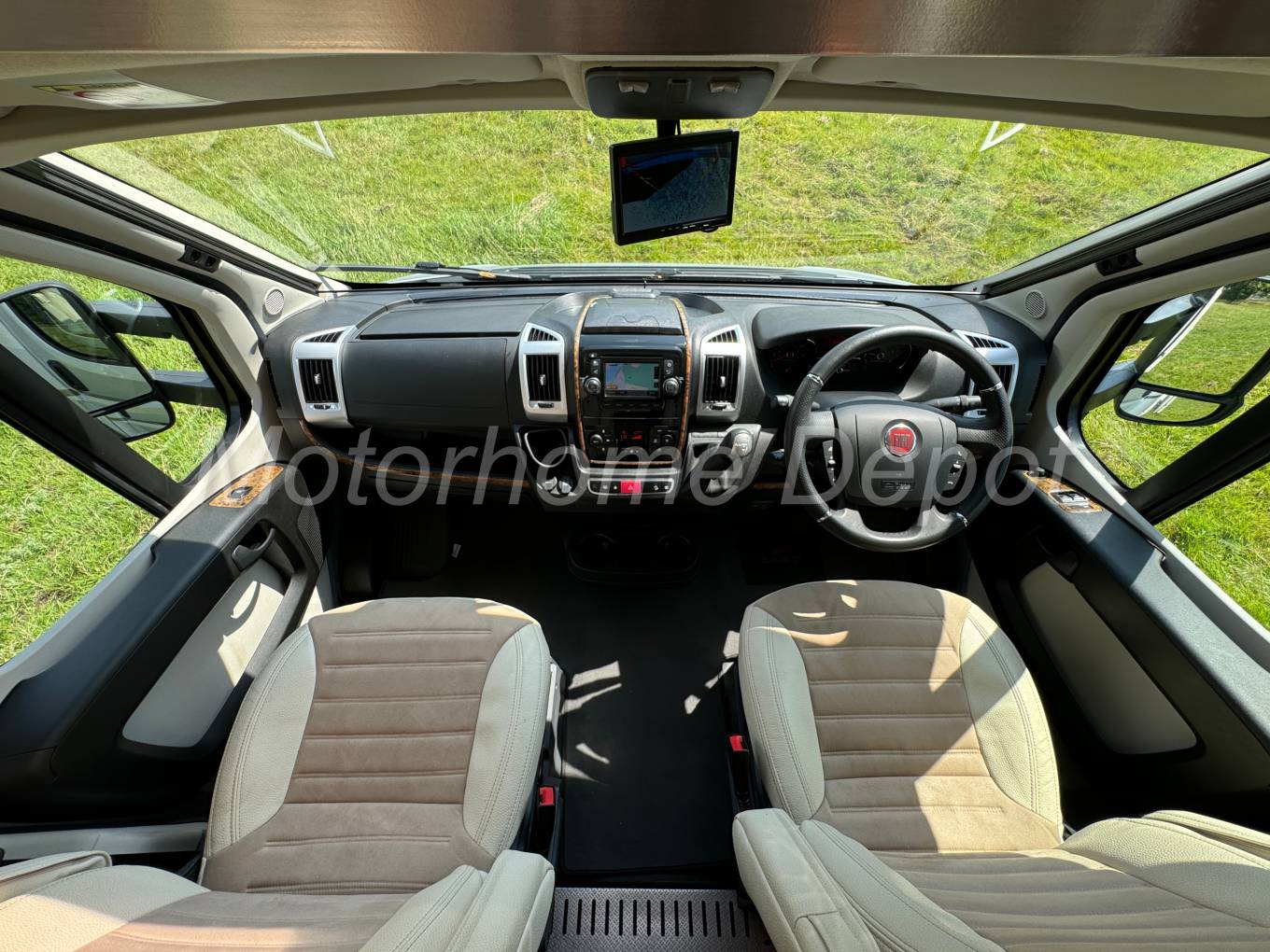 From under the Hymer umbrella comes the Laika Kreos 4009 with Dulca Vita Pack. Laika are built in their own bespoke factory in Tuscany and are passionate about producing quality motorhomes which is evident in abundance in this one. Based on the ever popular Fiat Ducato chassis with the 2.3D uprated 150 BHP engine & Comformatic 6 Speed Automatic Gearbox. It has only covered 10064 miles from new. The Cab benefits from: 16” Alloy wheels, LED daytime running lights, Leather steering wheel and gear lever, Chrome surrounds to instrument binnacle, DAB aerial on mirror, DAB/FM Radio/CD player with 5” touch screen monitor, Tom Tom Navigation System, Bluetooth Phone, Aux In & Usb connectivity, Steering Wheel Controls, Cruise Control, Reversing Screen , Remis Cab Blinds to front & Side windows, Front Fog lights, Electric Front Windows, Central Locking, Electric adjustable & heated Mirrors.