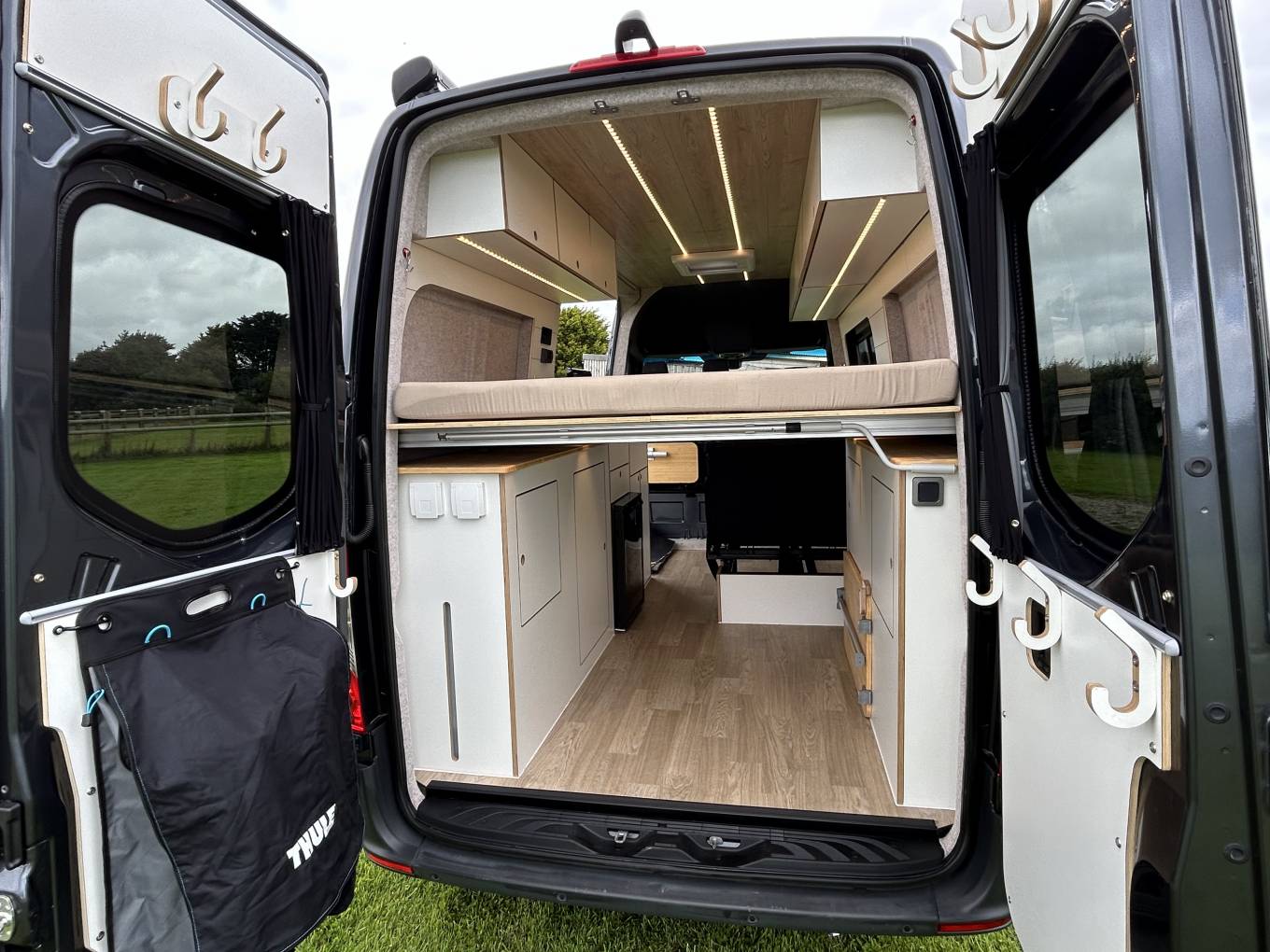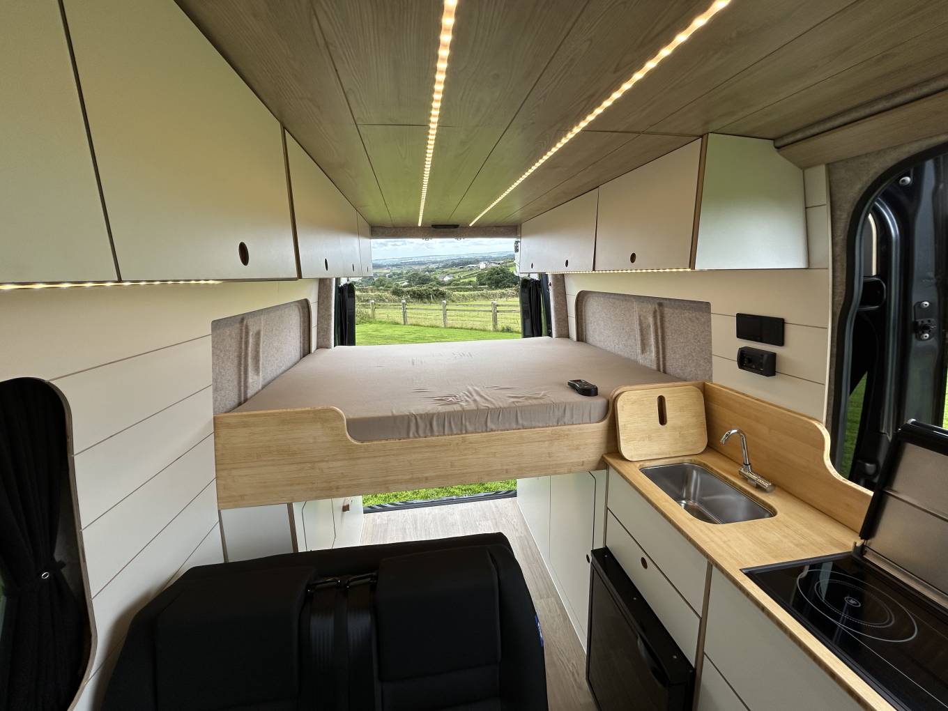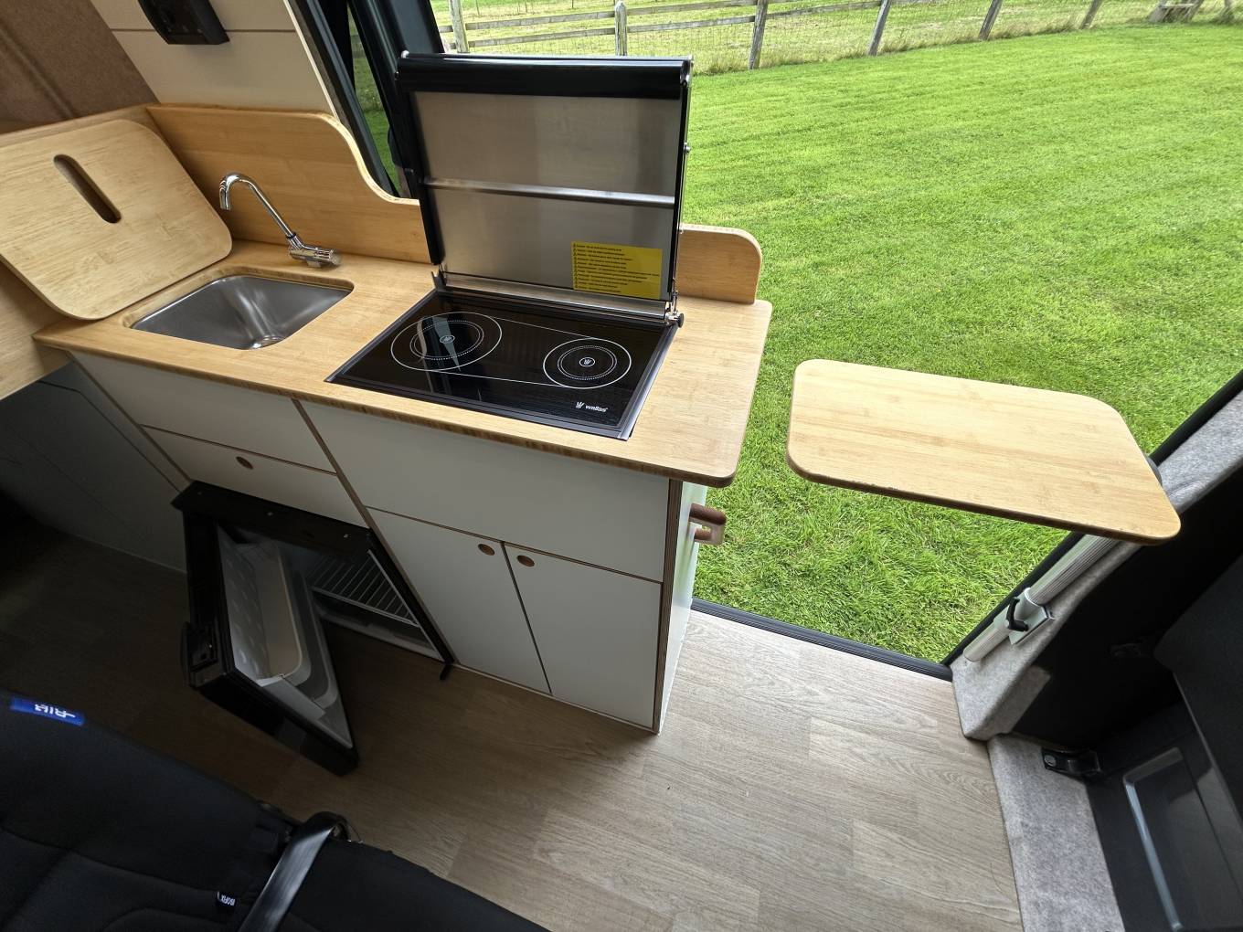 The camper is loaded with many desirable extras including; Cab Air Con, Cruise Control, 2 x Solar Panels, USB Points in the Front and Rear, 240 Sockets, Bluetooth, Apple Play, Electric Windows and Mirrors, Scorpion Tracker Cat 5 that is transferable, 2 Sets of Keys, Diesel Heater, Thule Omnister Wind Out Canopy, Twin Reversing Camera, Thermal Blinds, 28litres of Fresh Water, External Shower Point with Hose, Parking Sensors, DC-DC Charger, Leisure Battery and more with the WALLAS XC DUO combined hob and heater, the heater in this camper is ideal for those winter getaways and will ensure the van is a great hideaway from the cold days, evenings and nights.