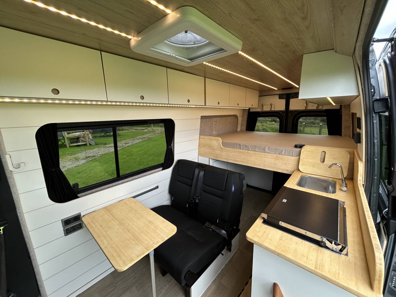 Mid habitation you have the kitchen area which comes with a cold water tap, 2 diesel powered hobs, a fridge with freezer space and table that offers a small prep area. This area offers plenty of natural lighting and comes with great ventilation from the sliding side door, you also benefit from a 2 way fan in the roof.