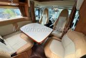 We enter the motorhome on the off side via an electric step immediately to the right is the dinette which comprises of an L shaped sofa immediately opposite, the forward facing part of the seat has two 3 point lap and diagonal seat belts for travelling passengers. To the right of the habitation door is a single seat ( also can be used as an occasional travelling seat ) & both the front seats rotate to join this area. You could easily seat 6 people round the table while entertaining on site. There is a pull up flatscreen TV from behind the single seat.