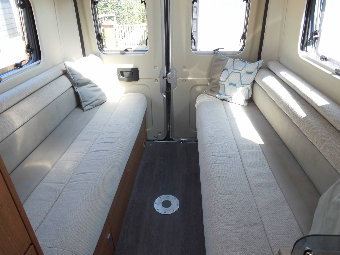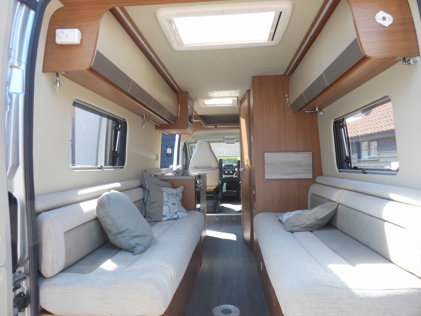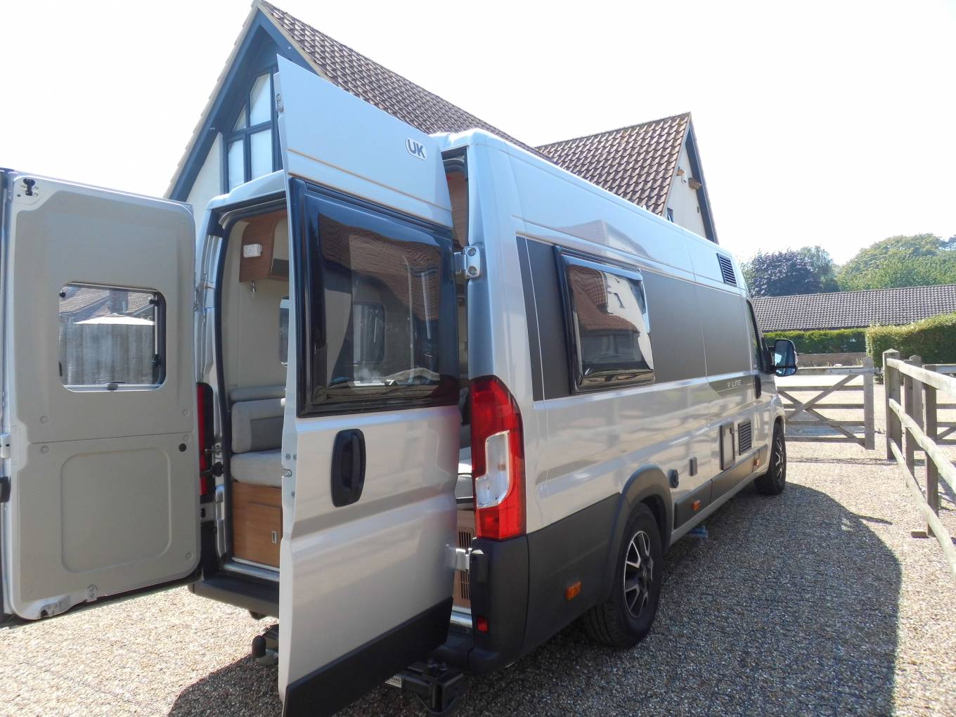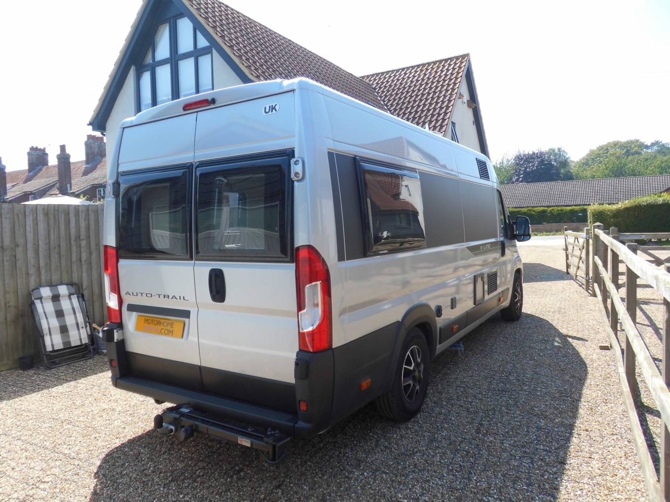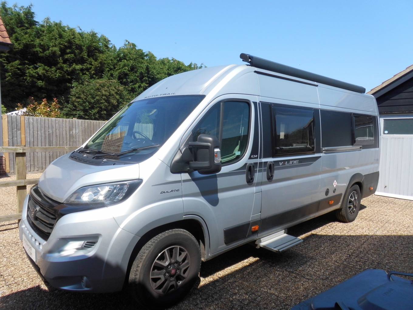 Fiat Ducato base, 2019, 6 speed Automatic, long wheel base Autotrail van conversion with opening side door and rear barn doors. Alloy wheels: Engine 2287cc 130 / re-chipped to 160bhp, cruise control; 6.34 meters long; gross weight 3500kg. 15708 miles 2 berth, 2 seatbelts, swivel cab seats, immobiliser + alarm for all doors, 2 keys. MOT til 08/04/25; Full Service History, last service 10/04/24; Full Habitation check 17/04/24; 1 previous owner. Underslung refillable LPG tank with drivers gauge. 70 litre clean water tank, Blown air heating gas and electric, solar panels on roof, electric step, cab aircon, sat nav, reversing camera, Bluetooth, DAB radio, TV ariel and wall bracket for tv. trauma heating and hot water controls. External BBQ gas point; wind out Thule awning. Dutch manufactured swing out bike rack so that the rear doors can be opened without removing the bikes. Kitchen has a full height 3 way fridge and freezer; oven and grill; 3 ring gas hob ,microwave, 4 storage drawers and 3 lower cupboards, flip up work top, sink with glass cover. Bathroom with cassette toilet, drop down sink, shower and mirrored storage cupboards. Storage space above cab; 2 roof lights, fly screens and blackout blinds at all windows. Rear sofas convert to 2 single beds, storage under seats and 7 upper eye line cupboards, a wardrobe and 3 drawers. Rectangular table stored behind driver and circular table in the wardrobe with fiama tri pod stand which can be used in or outside.