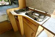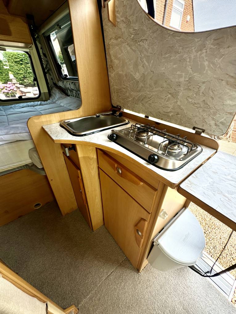 the side door open you have a Two Burner Hob, Large Sink plus Fridge-Freezer, plus