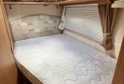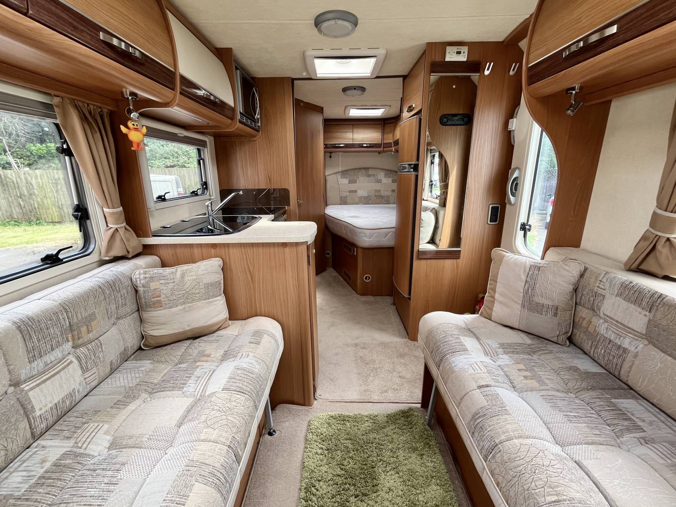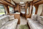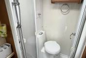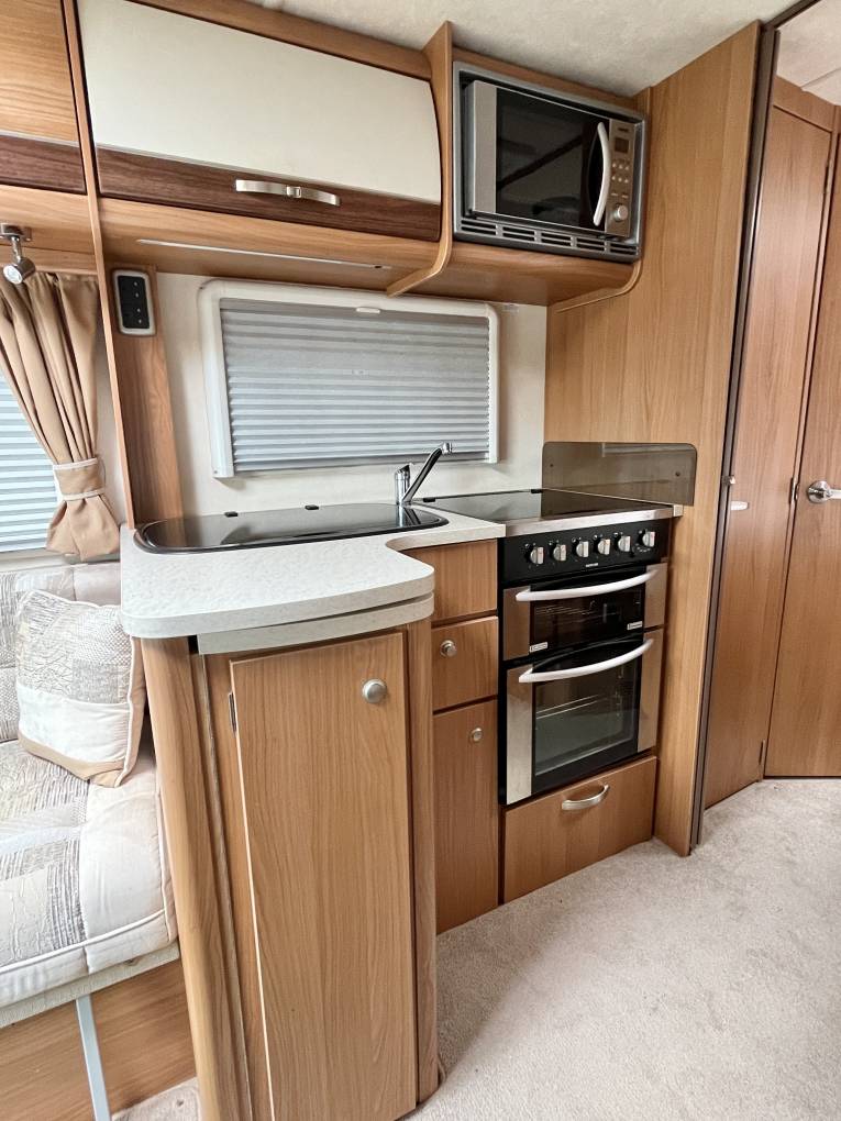 Behind the lounge is a well equipped kitchen area comprising of microwave, 4 burner hob (3 gas and 1 electric hotplate), separate grill and separate oven, good sized sink and drainer with hot & cold running water. There is plenty of storage and a pull out storage area which also gives you additional worktop space, opposite the kitchen area is a large fridge freezer with a free standing table located in a cupboard to the side.