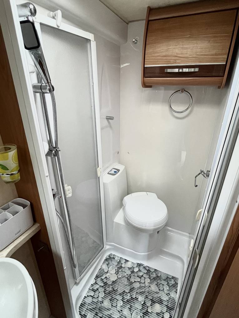To the rear of the van is a fixed french bed with good storage underneath and to its side a good sized washroom, toilet and shower area, a little further and you have a good wardrobe with hanging space and further storage below. This area can be separated off from the main lounge/kitchen area by means of a pull across pleated screen.