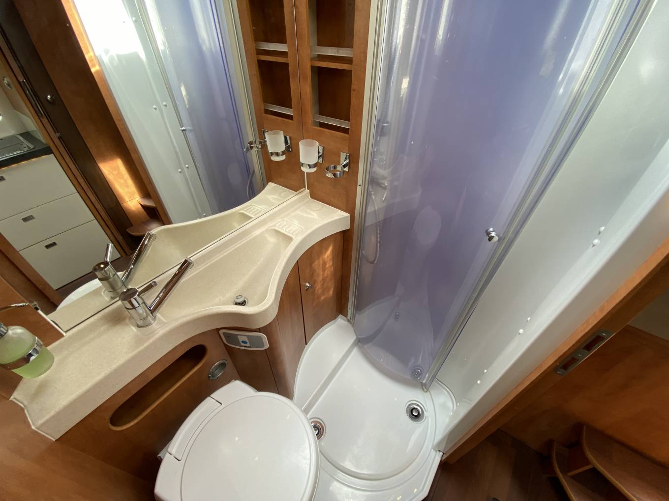 washbasin with mixer tap, a Thetford cassette swivel toilet, medicine cabinet,