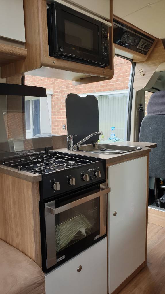 12v fridge/freezer, microwave, a sink, an extra extending worktop space and