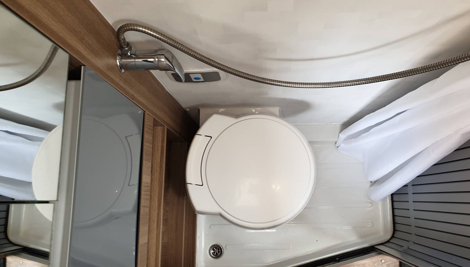 plenty of storage cupboards. Directly opposite is the washroom shower, cassette