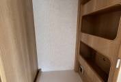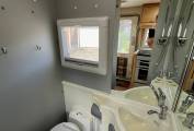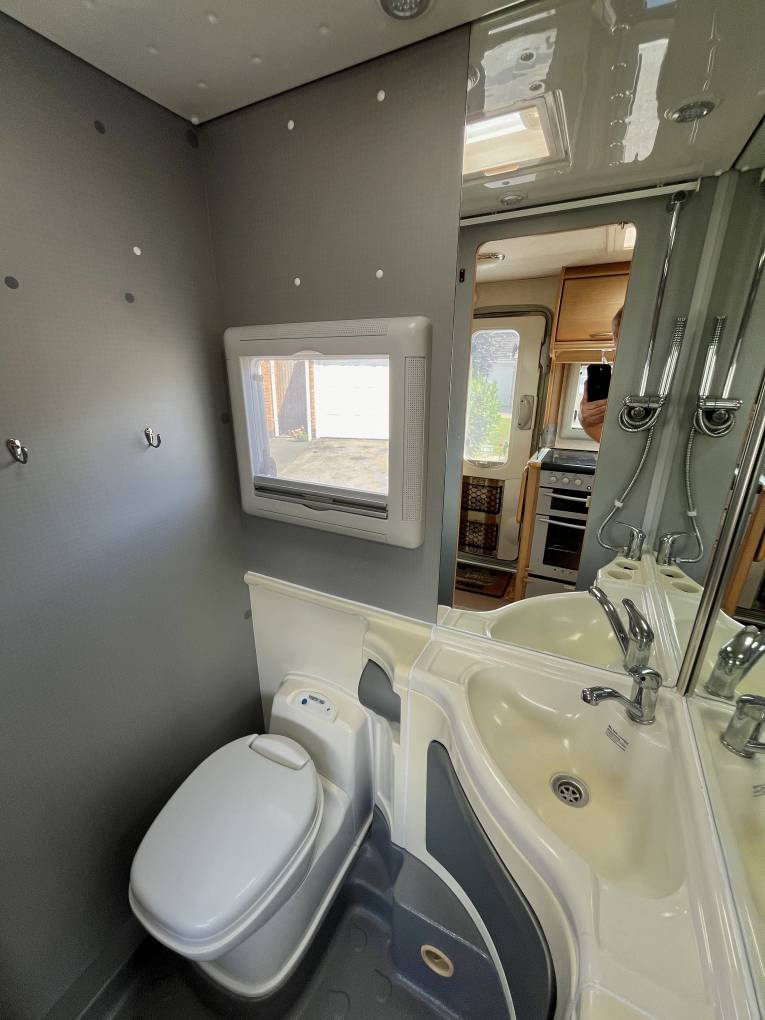As you enter the van you will see an overcab storage area and to its right the bathroom area door, inside comprising of wash room, toilet and shower to the side of this is a good sized wardrobe with hanging space and additional storage areas, below the wardrobe is the fridge with freezer compartment.