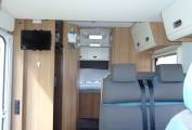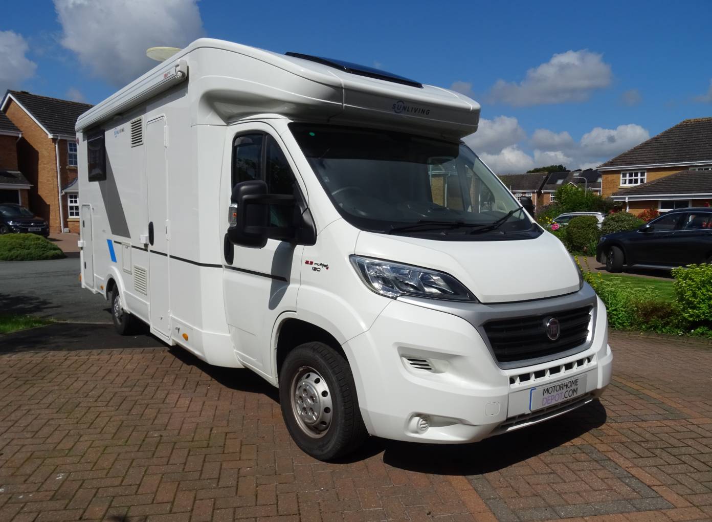For sale Adria Sun Living S70SC, based on Fiat Ducato 130BHP Auto gear box version. It’s a 5 berth with 5 seat belts. The front of the lounge area has load of natural light courtesy of the Large Heiki Rooflight. This area can comfortably seat up to 6 adult diners when utilising the wivel Captains seats. Above the lounge is a comfortable Drop Down Double Bed accessed by removable ladder. The seating area below also converts into a bed utilising the table and seat cushions, creating an Extra Sleeping Area.