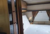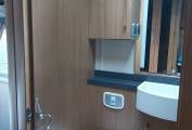 This 4-berth motorhome has two seatbelts and features a comfortable and versatile living space. The dining area seating converts into a double bed, and the rear bedroom's fixed transversal bed tilts for added comfort. A privacy blind can separate the bedroom area, which also includes extensive storage both below the bed and in the wall cupboards and wardrobe. The modern washroom has a separate cubicle shower, mixer taps, a cassette toilet, and a large mirror with a vanity unit.