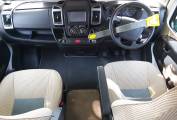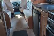 This motorhome is equipped with electric windows, electric wing mirrors, a reversing camera, a 6-speed manual gearbox, cruise control, air conditioning, and a sat-nav system. The captain's chairs provide comfort, while the built-in wifi booster ensures connectivity on the go. The spacious lounge area features a drop-down TV, built-in blinds and fly screens, and facing sofa seats that convert into an additional double bed. The dining area includes a folding dining table stored in a designated area and a small occasional folding table.