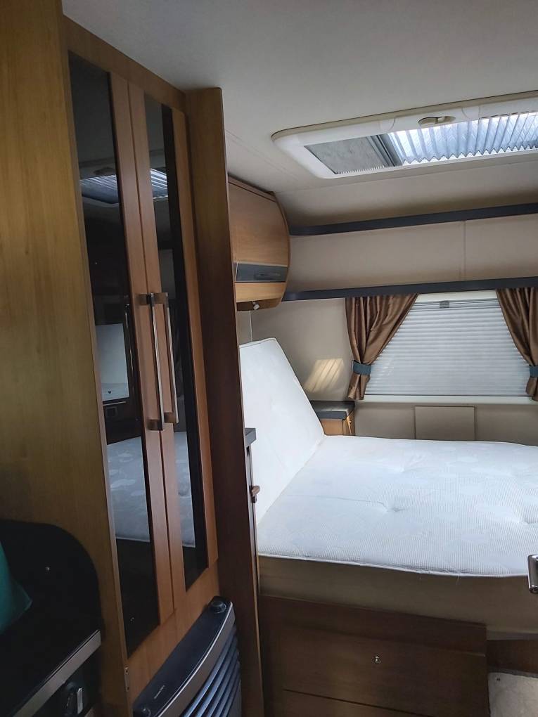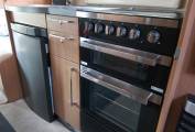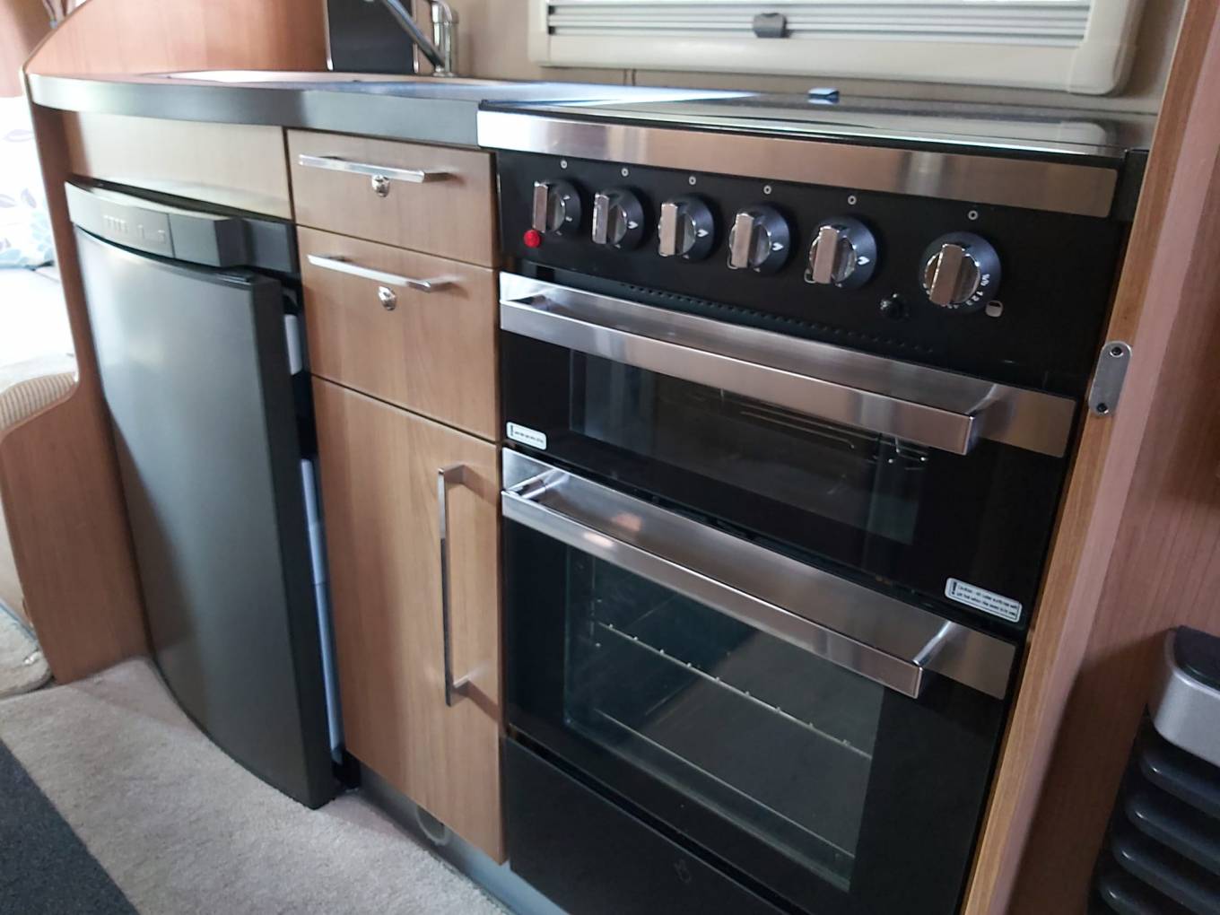 The kitchen is well-appointed with an oven, grill, 4-burner hob (gas and electric), a 3-way fridge and freezer, a built-in microwave, and an electric ceiling fan. The Truma heating system ensures warmth throughout. Storage is ample with numerous cupboards, and the rear of the motorhome boasts a fixed transversal island double bed with under-bed storage and an Avtec TV. There is also a wardrobe for your belongings.