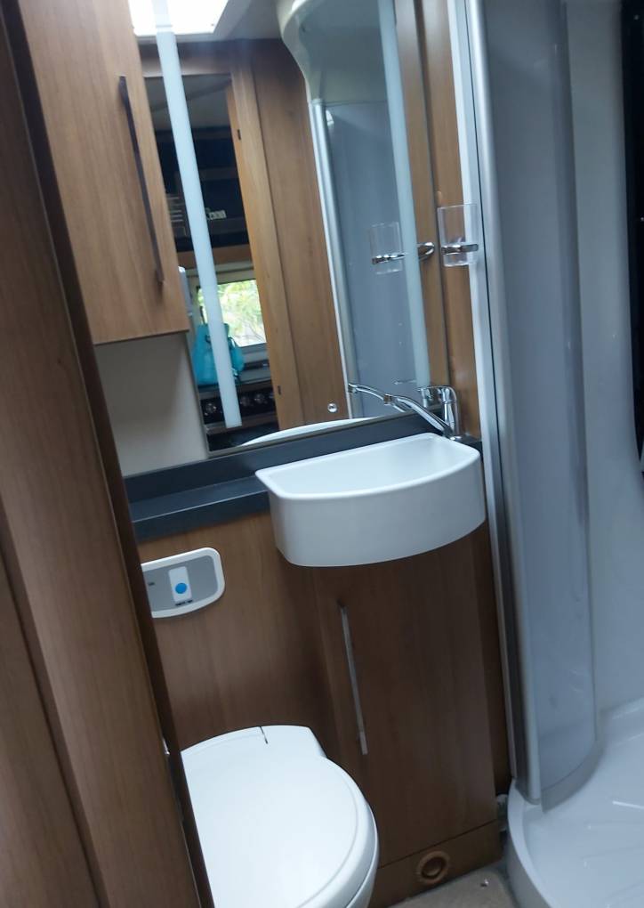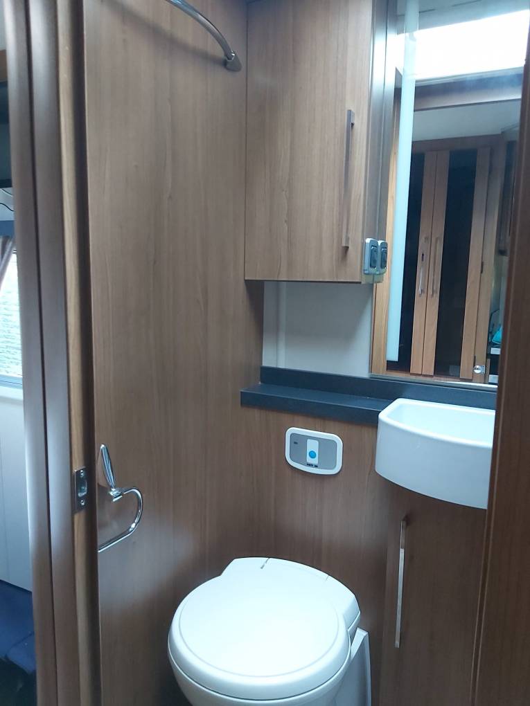 The washroom includes a cassette toilet, a separate shower, a mixer tap, and a basin. An electric step provides easy access.