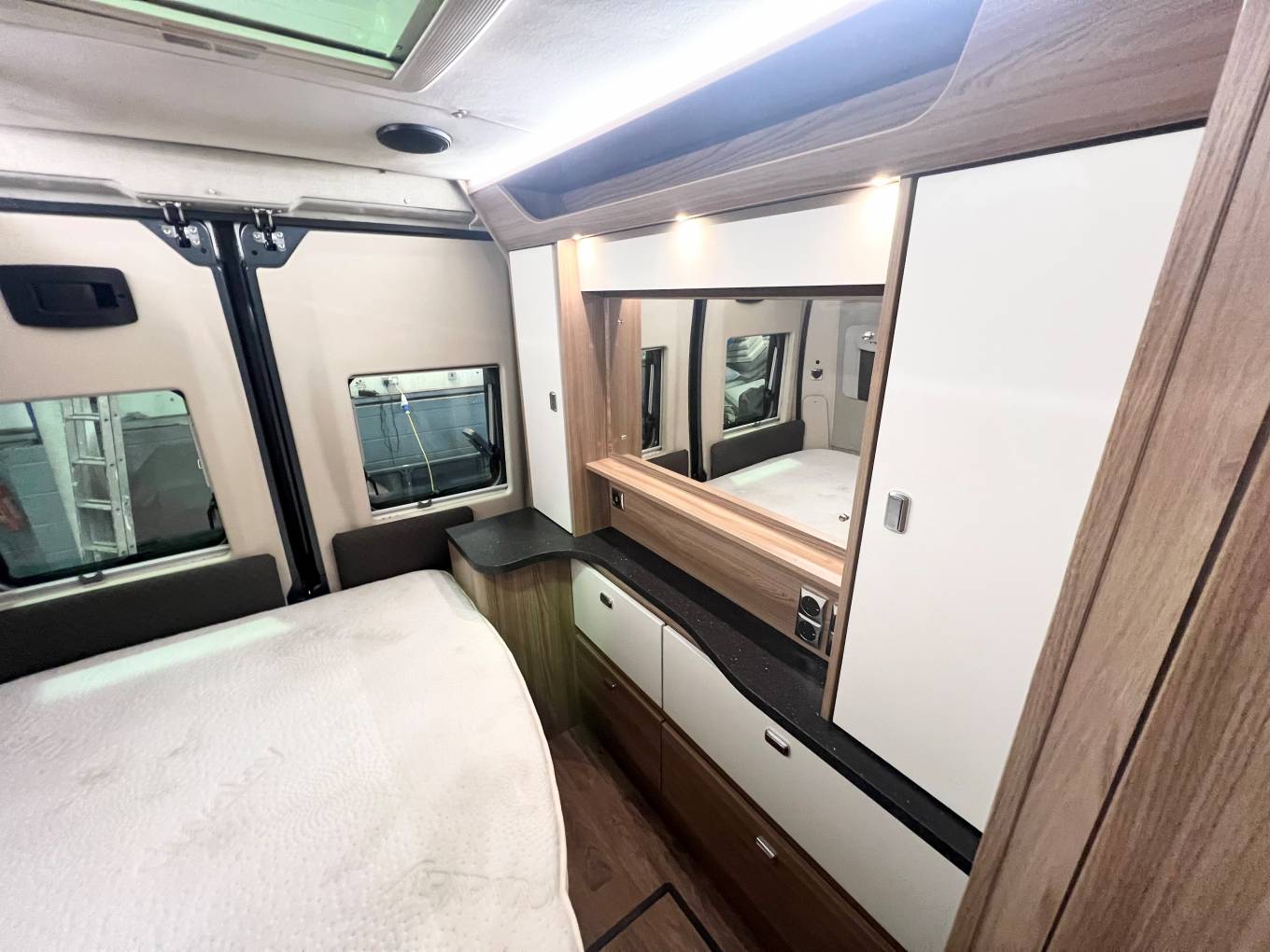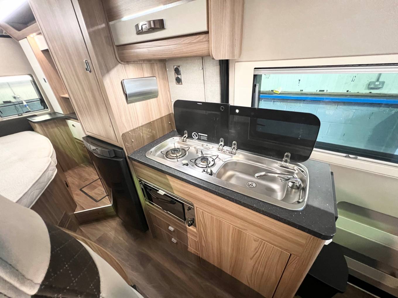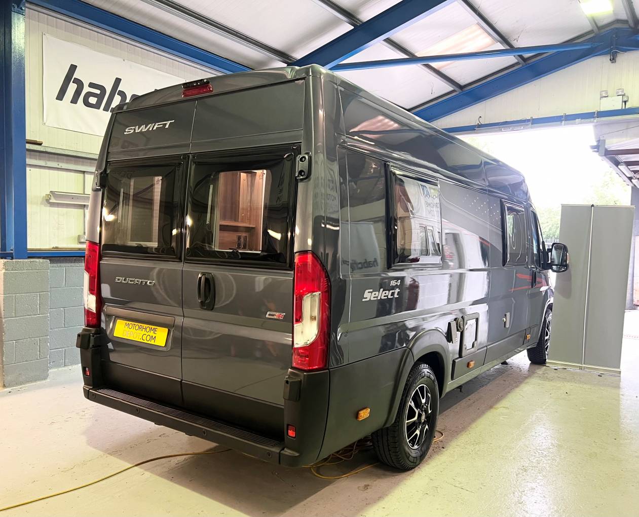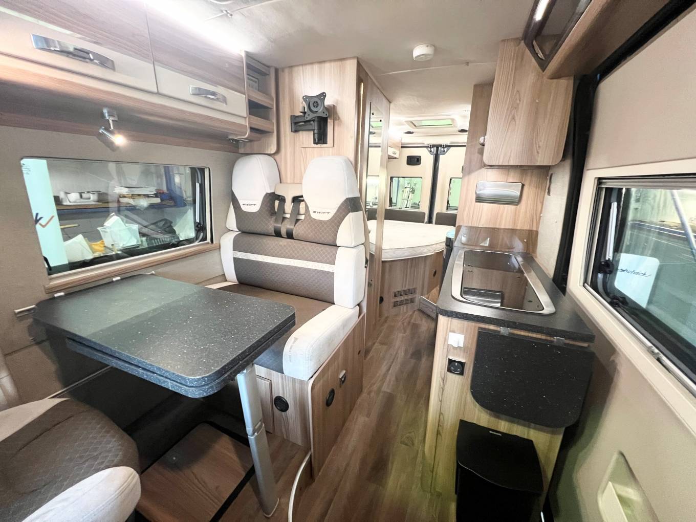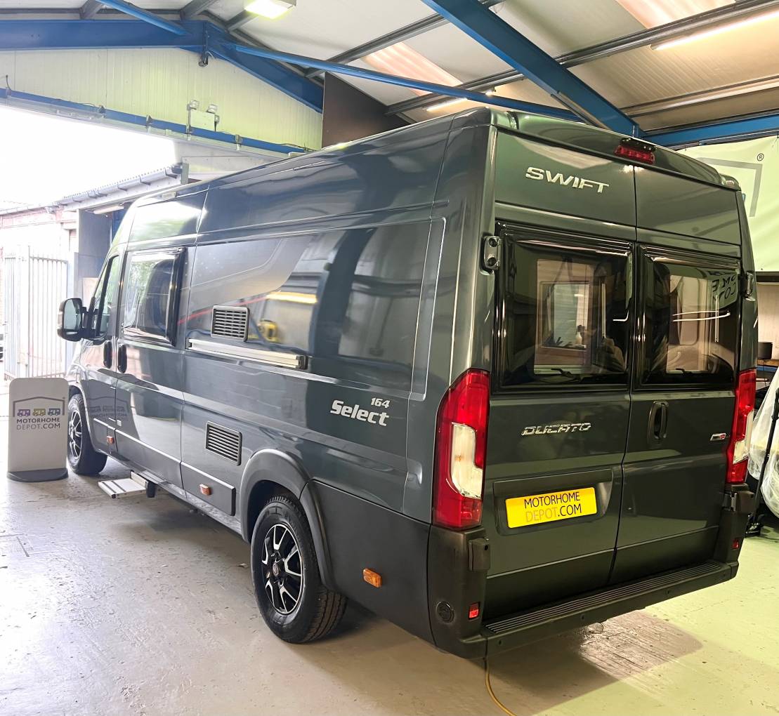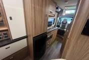 Introducing this 2021 Swift Select 164 for a Fantastic price, a one owner from new campervan with three berths, four seatbelts and Euro 6, with 6 Speed Manual Transmission . The cab benefits from a/c, cruise control, reversing camera, electric windows, 12v and USB port. To the rear is a lovely bedroom area with a fixed French bed with plenty of storage underneath and side/overhead lockers, the bed has a stylish dressing table/storage area to give you your home comforts. There are fly screens and blackout blinds on all habitation windows with concertina blinds in the cab. The living and dining area features twin Captain’s seats that swivel to face the rear, a forward facing double seat and a large extending/removable table in between creating a nice spacious area for relaxing and dining. Washroom - Electric flush cassette toilet, sink with tap that doubles as a shower head, shower curtain and good storage. The hot water and heating are provided by a Truma Boiler able to run off Electric or Gas. Kitchen – 2 x Burner gas hob, oven, grill, sink with hot and cold running water, fridge/freezer and good storage space. The garage space at the rear of the van is accessible via the full size rear doors and the underbed storage has twin access doors and a lift up bed frame.