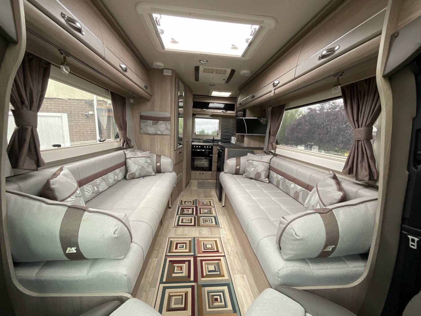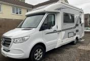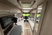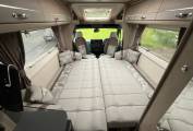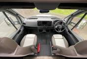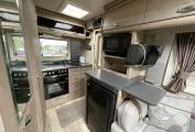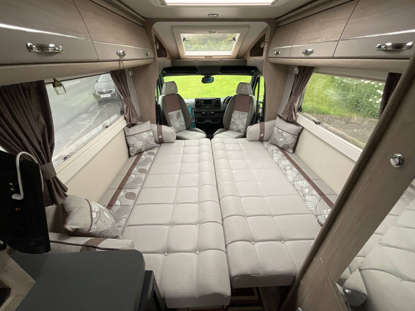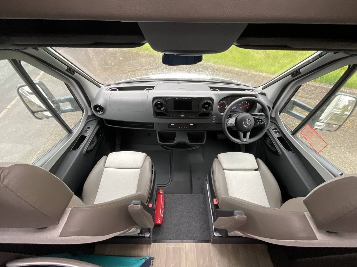 The cabin has air conditioning, cruise control, Remis blinds, MBUX media system and rear reversing camera. It is a 2 berth / 2 belt motorhome with an end kitchen layout and a spacious lounge area which can also convert to two good sized single or a large double bed.