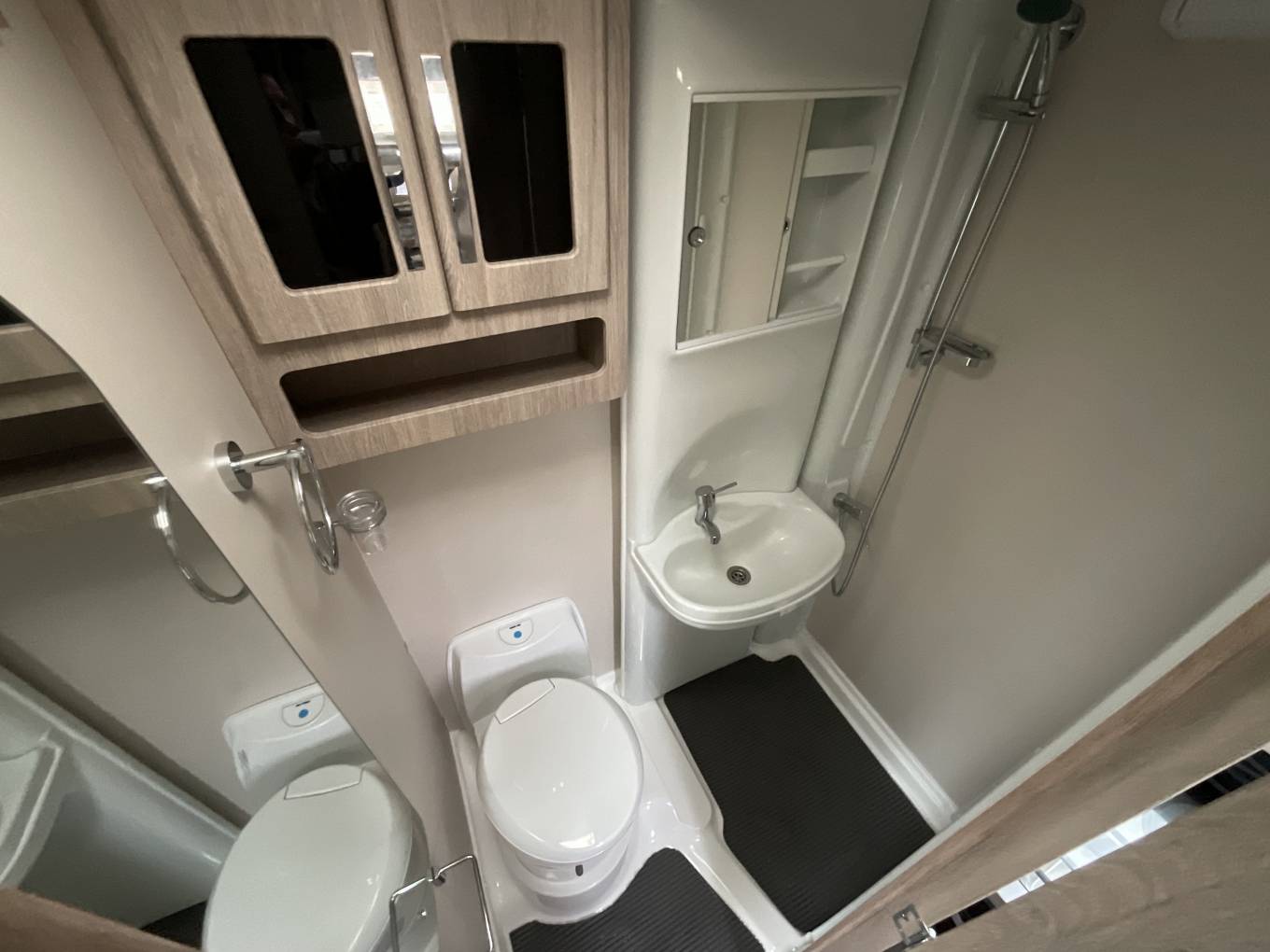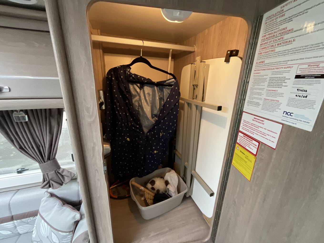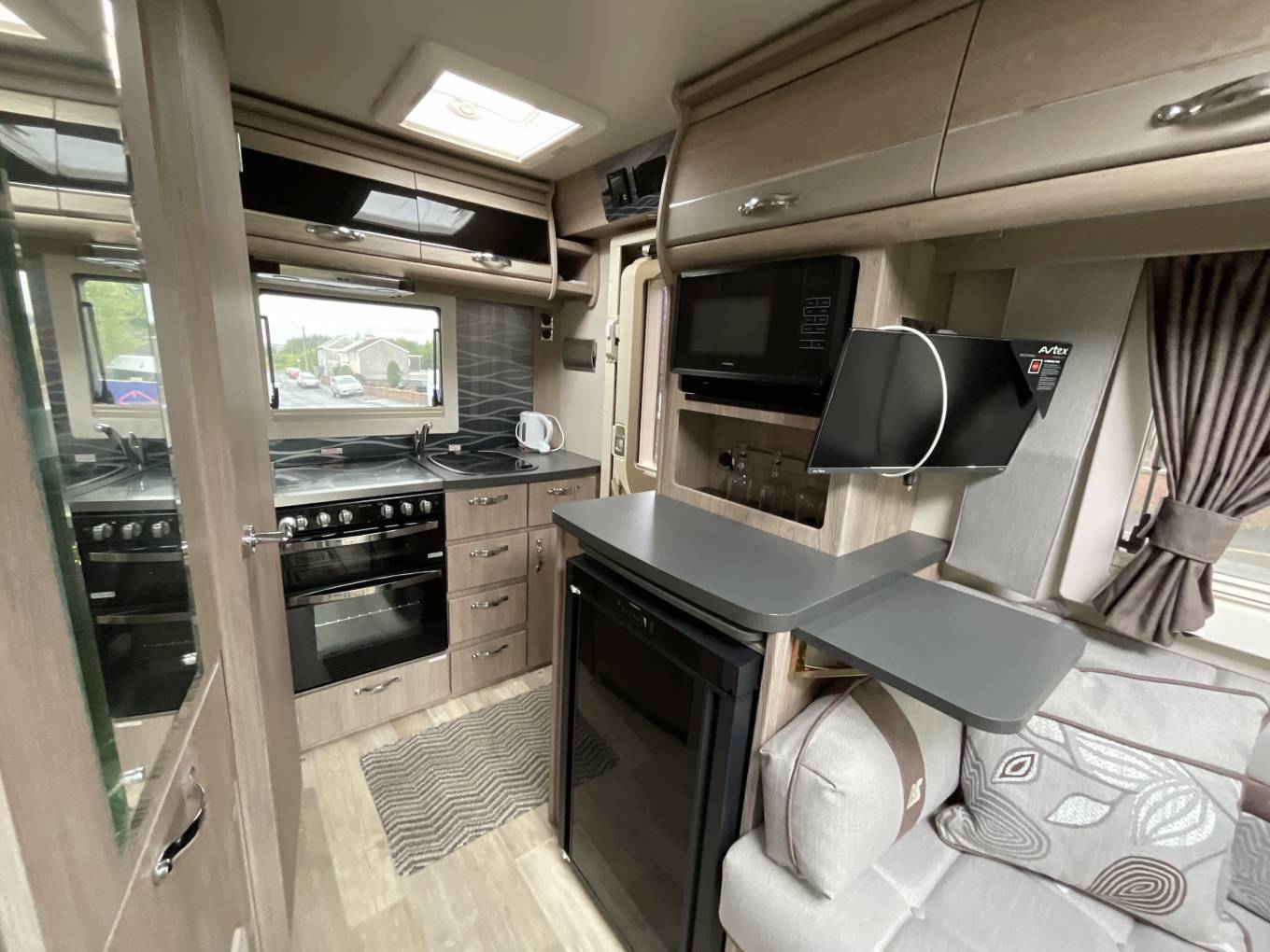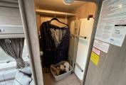Upon entering the van you will notice the well equipped kitchen, comprising of a 4 burner hob, (3 gas plus 1 electric hotplate), full size oven with seperate grill, kitchen extractor, sink and drainer with hot and cold running water, microwave, fridge with freezer compartment and with additional pull out workspace above. Opposite the kitchen is the wash room, toilet and separate swing wall shower area. Also you have a good sized hanging wardrobe which holds both the free standing and occasional tables. Once in the lounge you will see the twin benches in the spacious socialising area, both front seats can be swiveled into the lounge area to create a good entertainment space, above the lounge there is plenty of storage in the overhead lockers and also under the twin benches. Also in the lounge area you have an Avtex Tv, and Wi-fi connectivity along with the Truma air conditioning unit. The habitation area is also complete with window blinds and fly screens and a flyscreen on the habitation door. The van has Truma air blown heating throughout, which is i-net ready (sim card required). There is a 25ltr LPG underslung gas tank as standard and also benifits from a solar panel, external gas and electric sockets, two water infil points, wi-fi booster and a Thule wind out awning with awning light.
