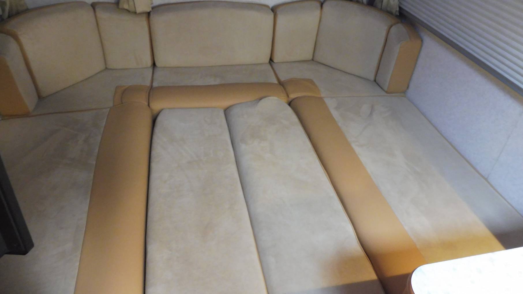 On entering, the first impression is of light, masses of it. Three big windows in the rear U-shaped lounge make this a great place from which to appreciate our beautiful countryside, or for keeping an eye on the comings and goings in and around the campsite. The LED lighting adds to this feeling of airiness and they can be dimmed down to a cozy blue-light at night.