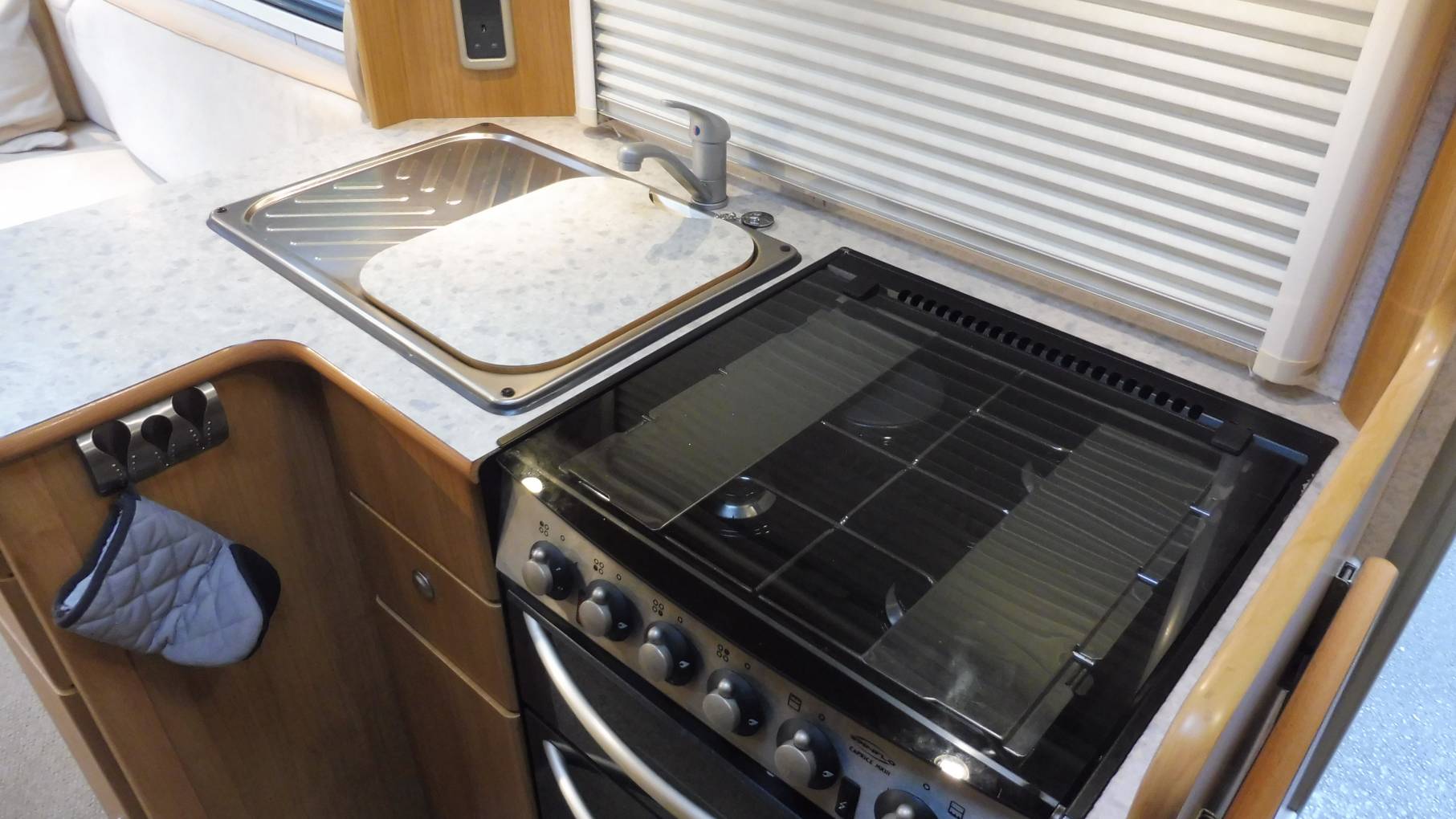 The habitation door delivers you into an L-shaped nearside kitchen, which sits opposite the washroom, located immediately behind the driver’s seat. The washroom profits from a separate shower cubicle with a bi-fold door, so there’s no mop required after a shower.