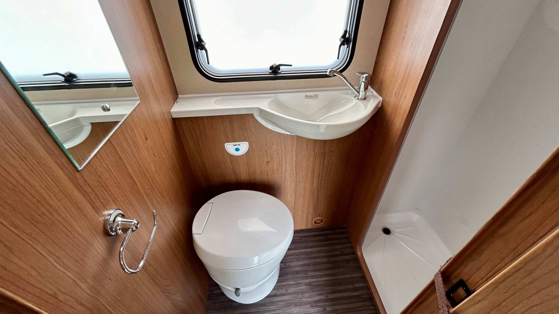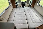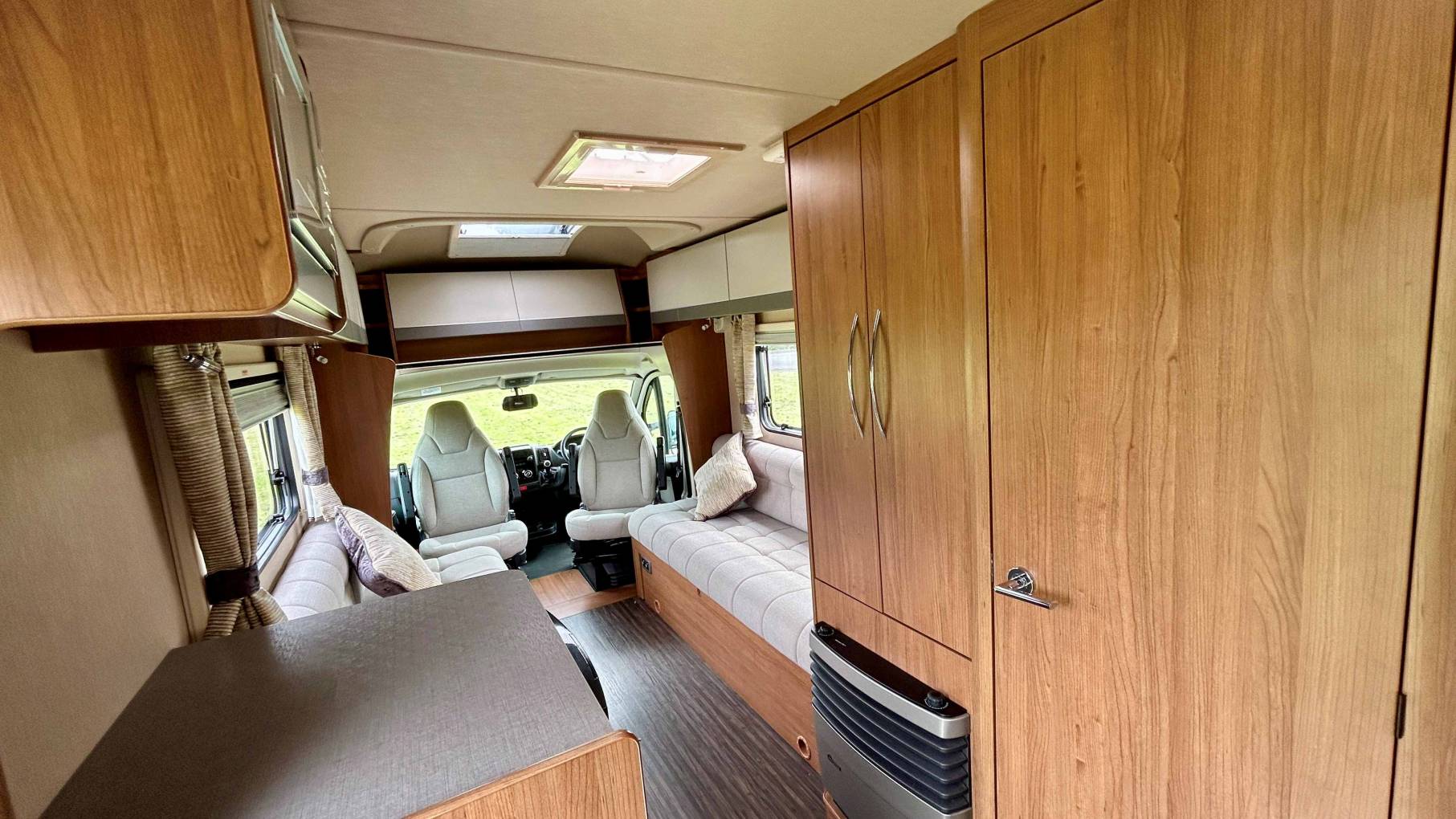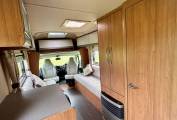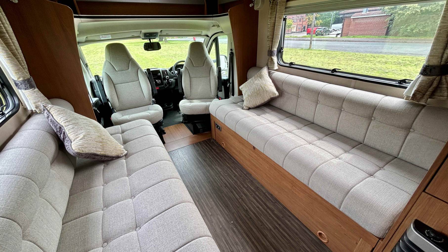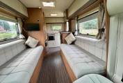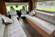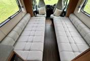 The layout consists of a large front lounge which makes use of the front swivel cab seats to create a large lounge/dining area that also converts into a large double bed or 2 singles. The fully equipped kitchen is at the rear of the motorhome with an oven with grill, 3-burner gas hob, microwave, sink with a mixer tap and a Dometic fridge with freezer compartment. Next up is the fantastic washroom with Thetford swivel toilet, hand basin, storage cupboards and a separate shower cubicle. The heating and hot water systems are supplied by a Truma unit and there are removeable carpets throughout. The motorhome has a Vision Plus 12v TV/DVD, Built-in Remi concertina blinds cover the cab windows to give privacy, leisure battery, 100W solar panel and an outside TV point.