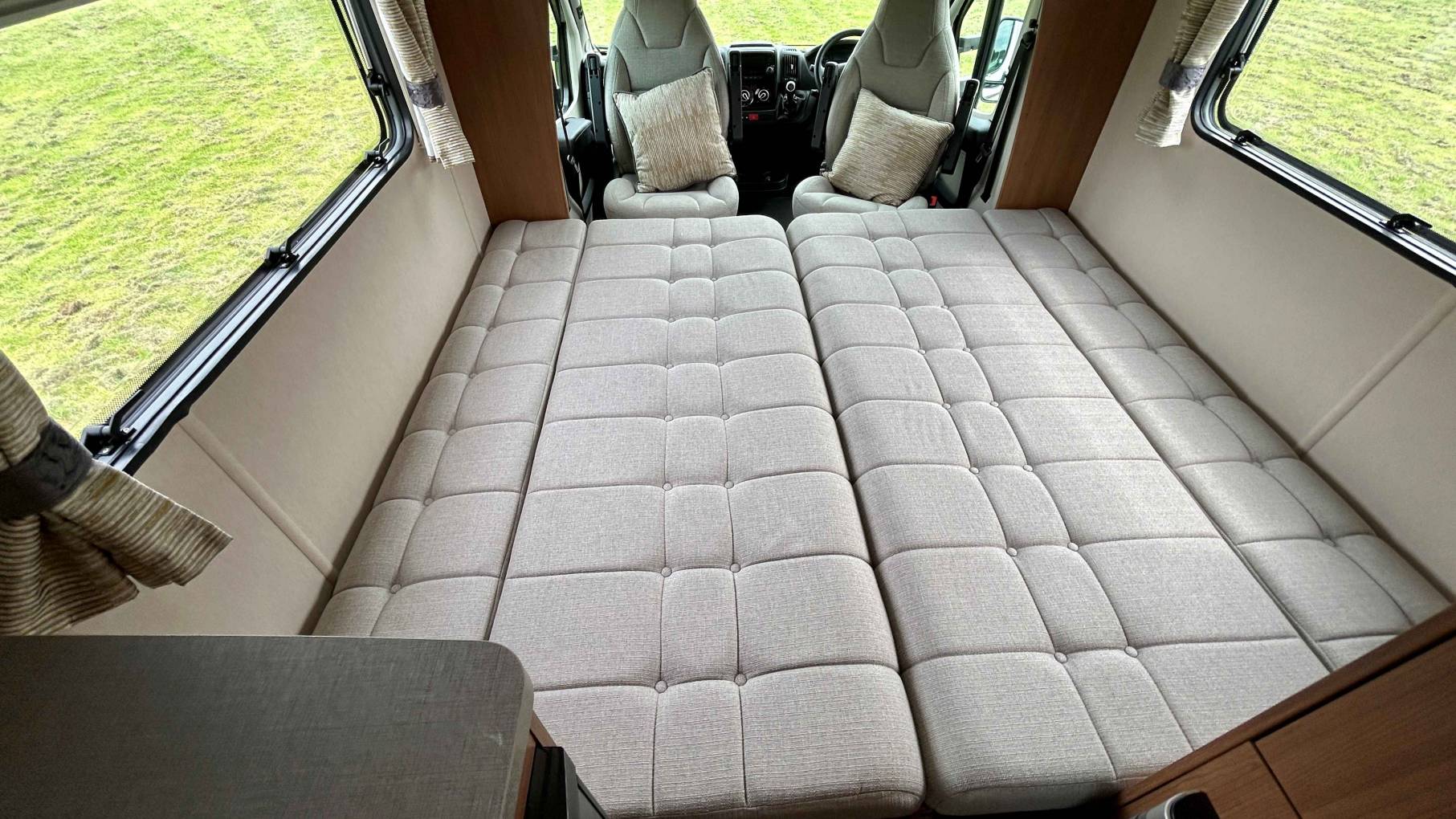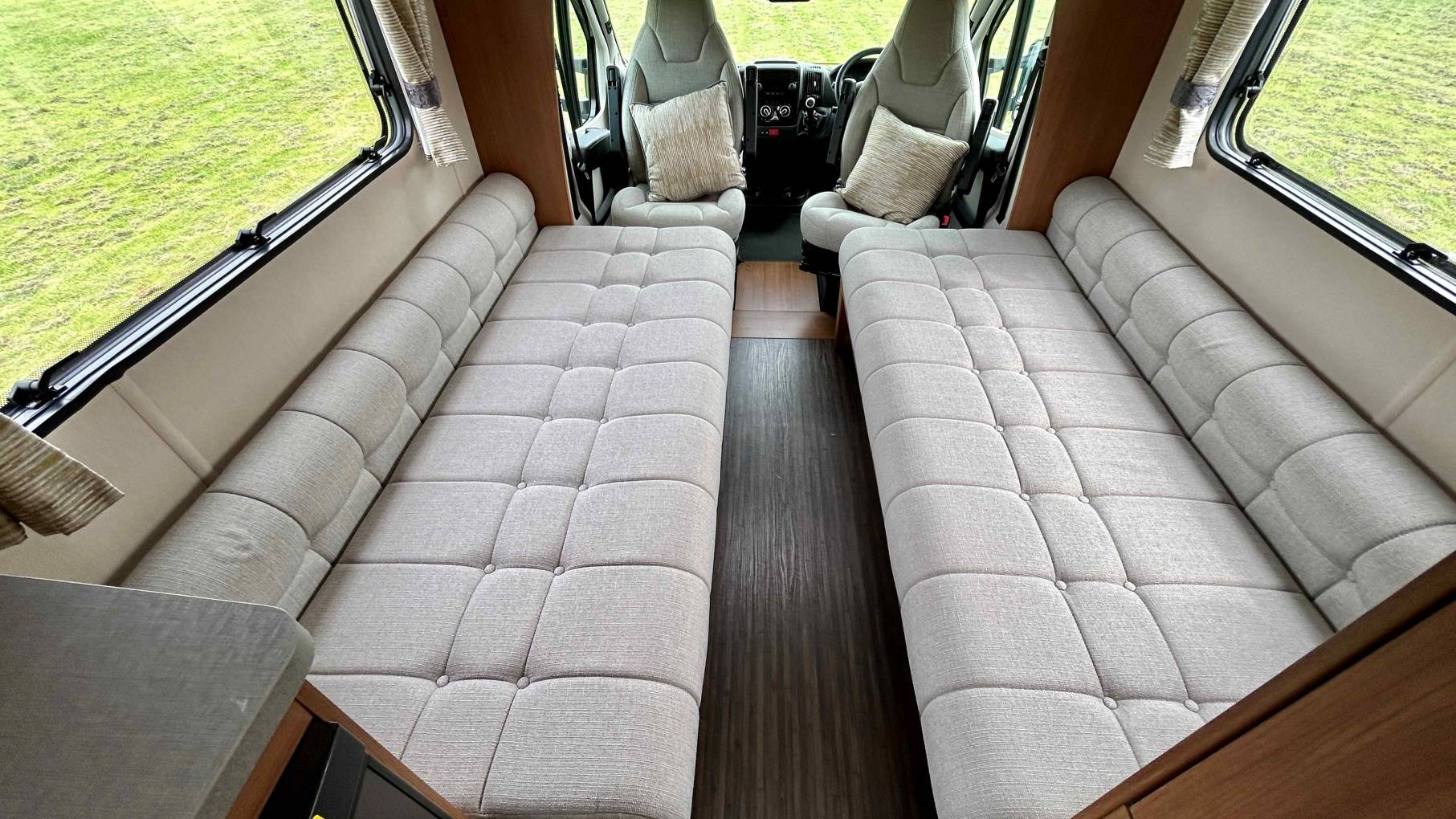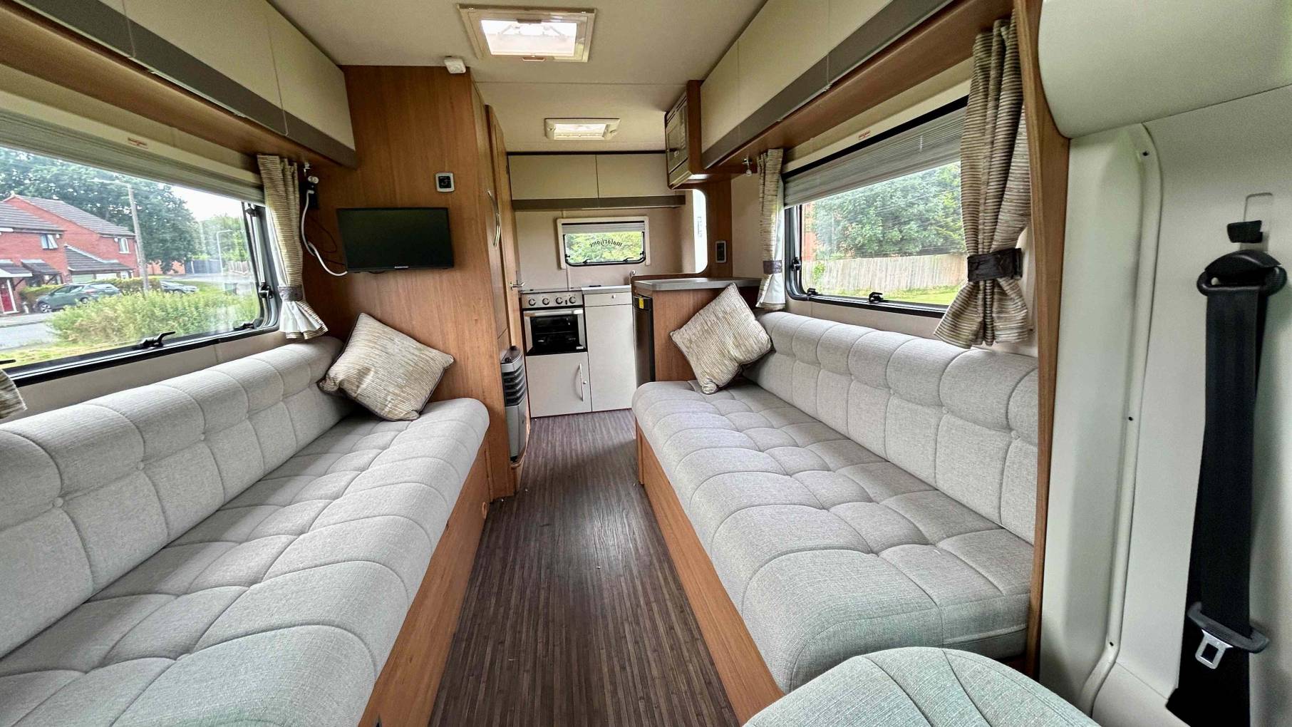 The layout consists of a large front lounge which makes use of the front swivel cab seats to create a large lounge/dining area that also converts into a large double bed or 2 singles. The fully equipped kitchen is at the rear of the motorhome with an oven with grill, 3-burner gas hob, microwave, sink with a mixer tap and a Dometic fridge with freezer compartment. Next up is the fantastic washroom with Thetford swivel toilet, hand basin, storage cupboards and a separate shower cubicle. The heating and hot water systems are supplied by a Truma unit and there are removeable carpets throughout. The motorhome has a Vision Plus 12v TV/DVD, Built-in Remi concertina blinds cover the cab windows to give privacy, leisure battery, 100W solar panel and an outside TV point.