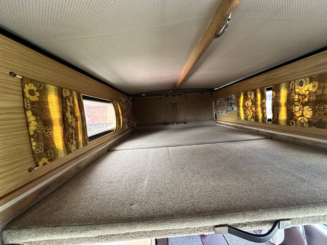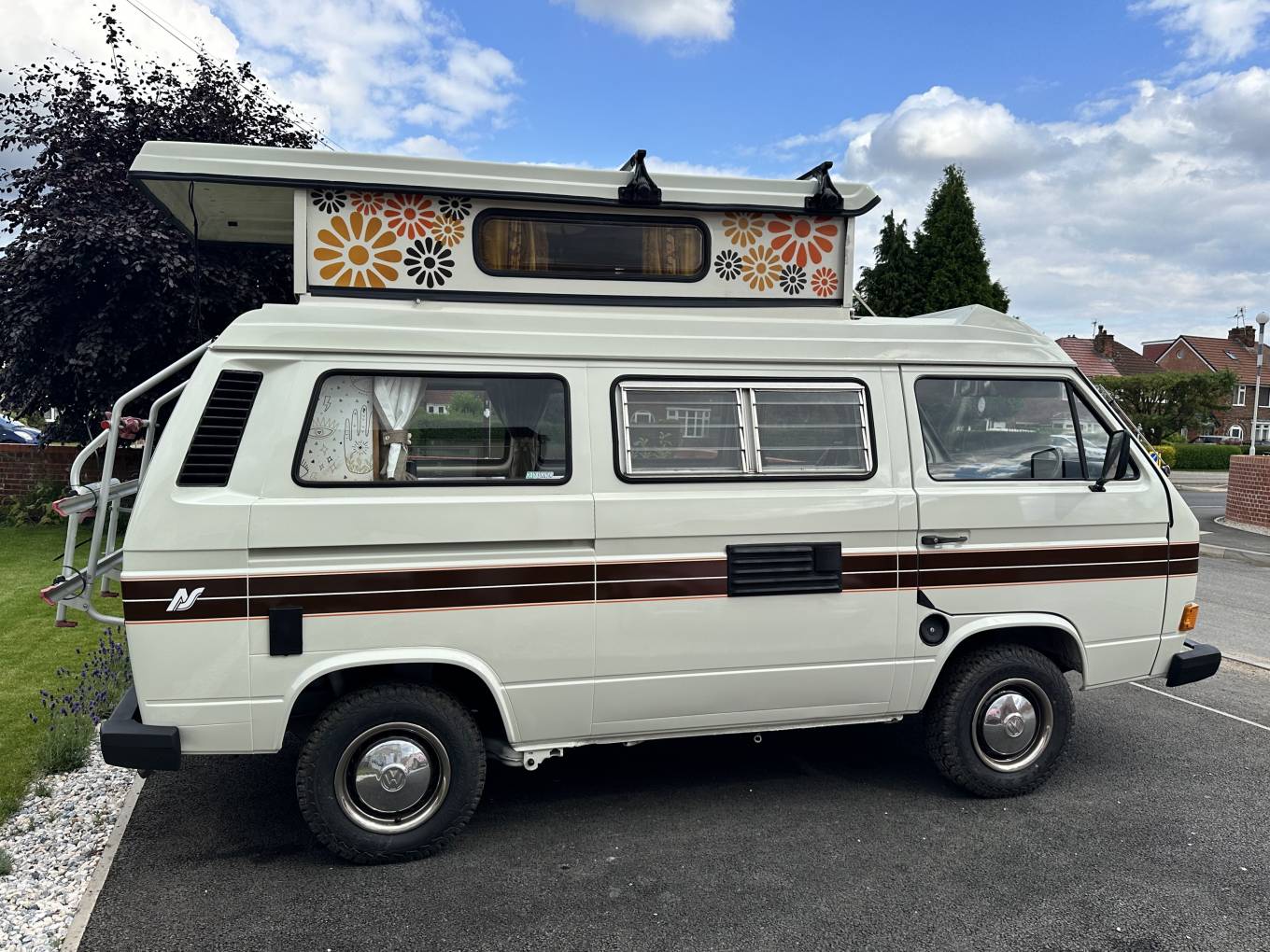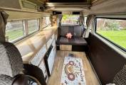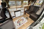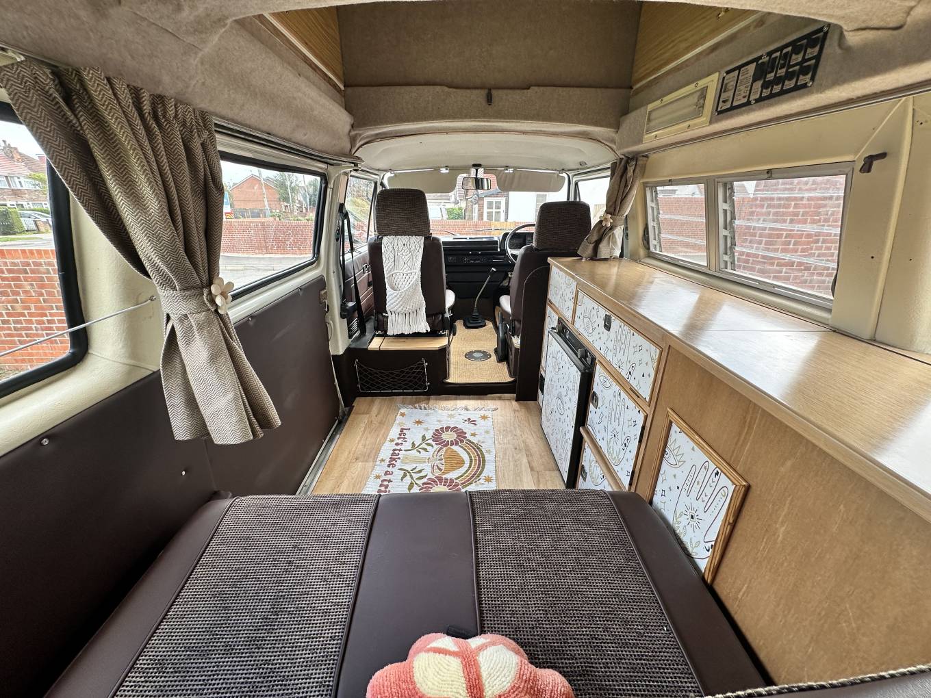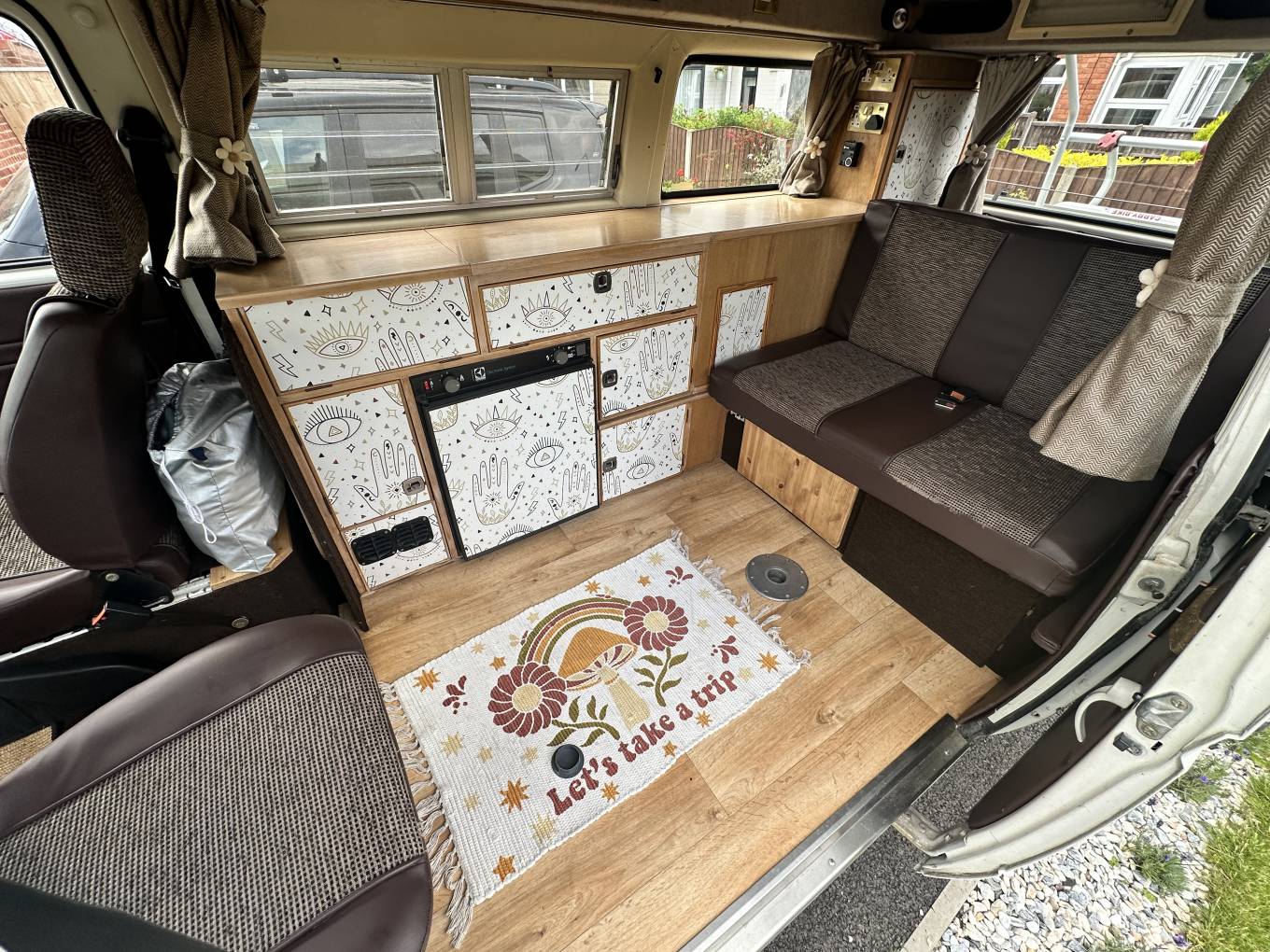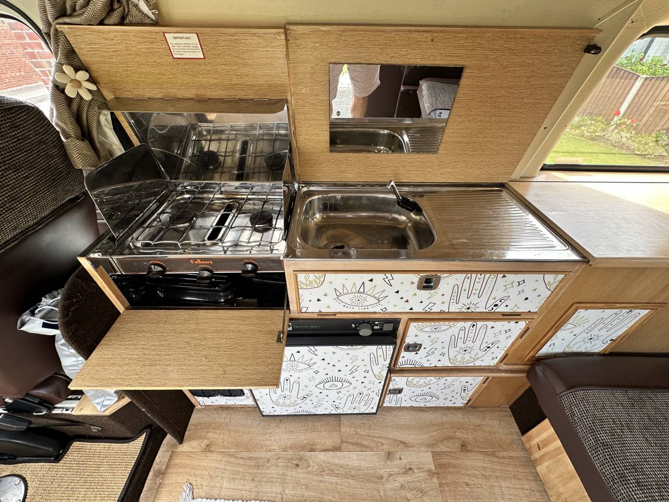 Meet Hetty a much loved VW Camper that has enjoyed many family camping trips and has been lovingly updated while still retaining some of its charm. It has recently undergone a full respray in its original Volkswagen colour with added retro flowers on the pop top sides. This impressive Autosleeper conversion is in great condition and offers an excellent layout. The upholstery has been recently updated and is in excellent condition. To the back is a rear bench that seats 2 comfortably and converts to a double bed at night. To the rear there is also plenty of storage along the side, below the bed and in the wardrobe. Next, we are greeted by the kitchen area that consists of a 3 way fridge, 2 ring gas hob, grill, wash basin and draining board. Finally, above in the pop top there is room for 2 to sleep completing the 4 berth.