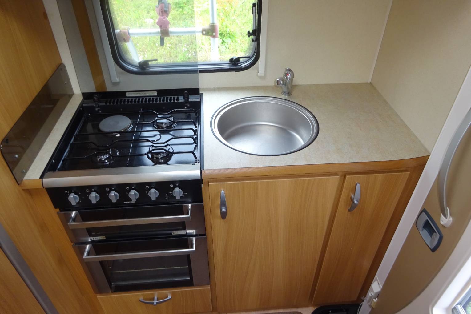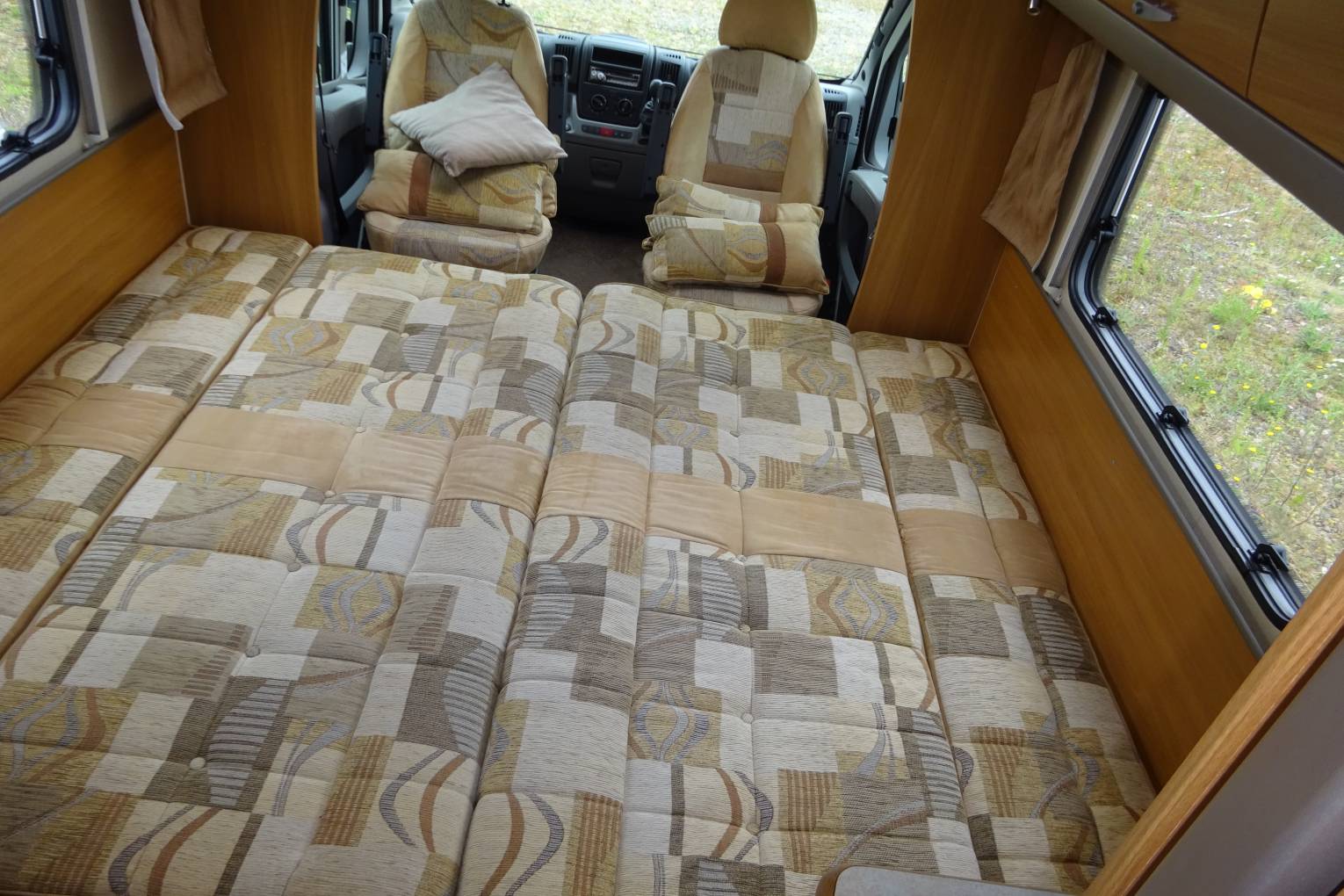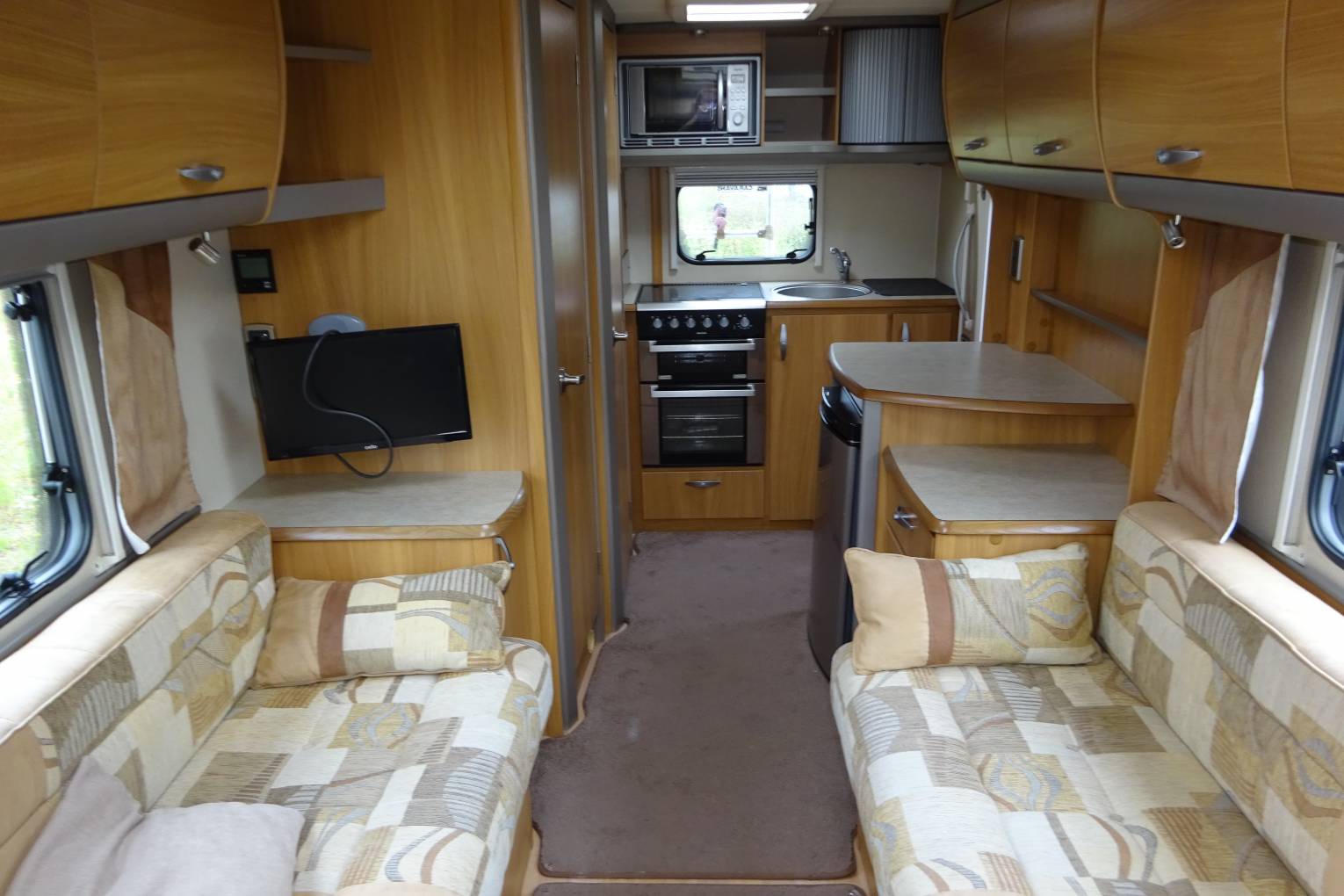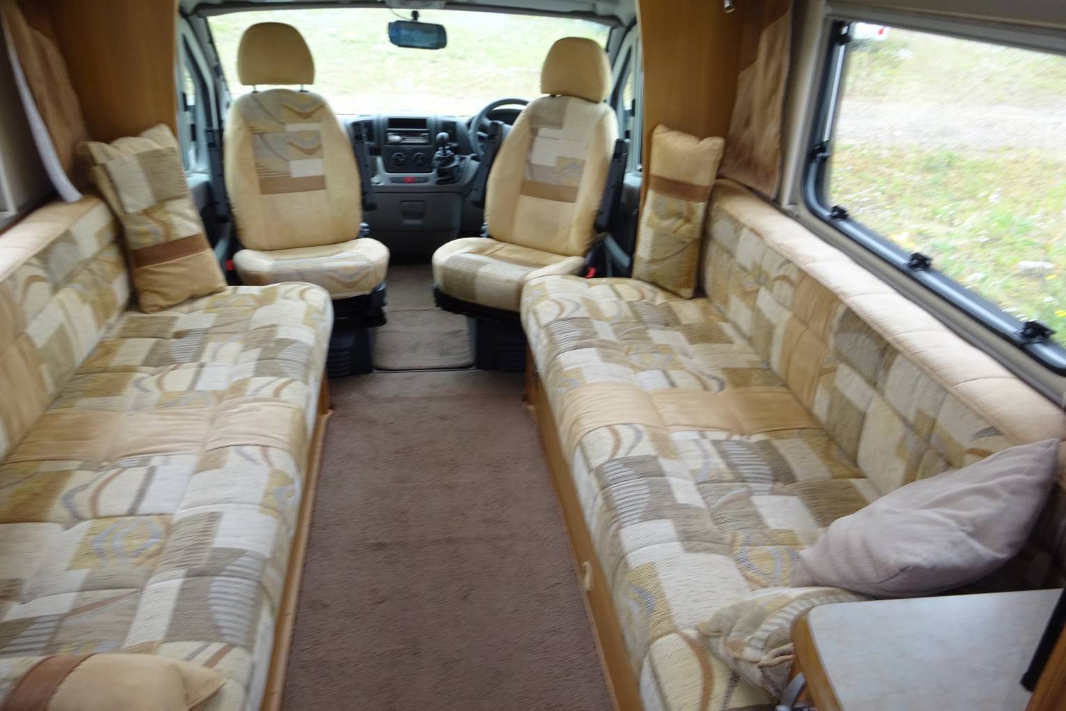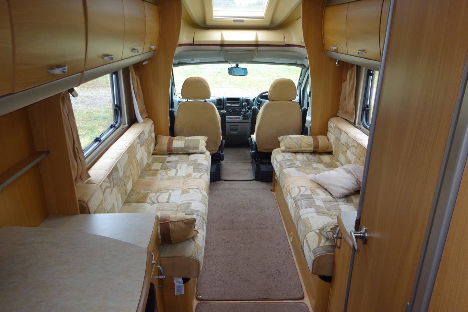 As you step inside the motorhome you get a real feel for the condition of the Motorhome with a light, warm, comfortable feel. The end kitchen layout makes good use of the space, allowing for a spacious living area. The well equipped kitchen with a 3 burner gas hob supplemented by a 4th electric ring, oven and grill, sink, microwave, and three way fridge allows for all your cooking needs. It has a good sized bathroom with a separate shower, offering what you would expect from a motorhome of this standard. The living area has two captains chairs as well as the two long settees and is completed with a fold away table that sits nicely between the seats. The settees easily makes up in to a large double bed or are long enough to use as 2 single beds There is ample storage throughout the motorhome for all your needs. The furnishings and cupboards are all in good condition.