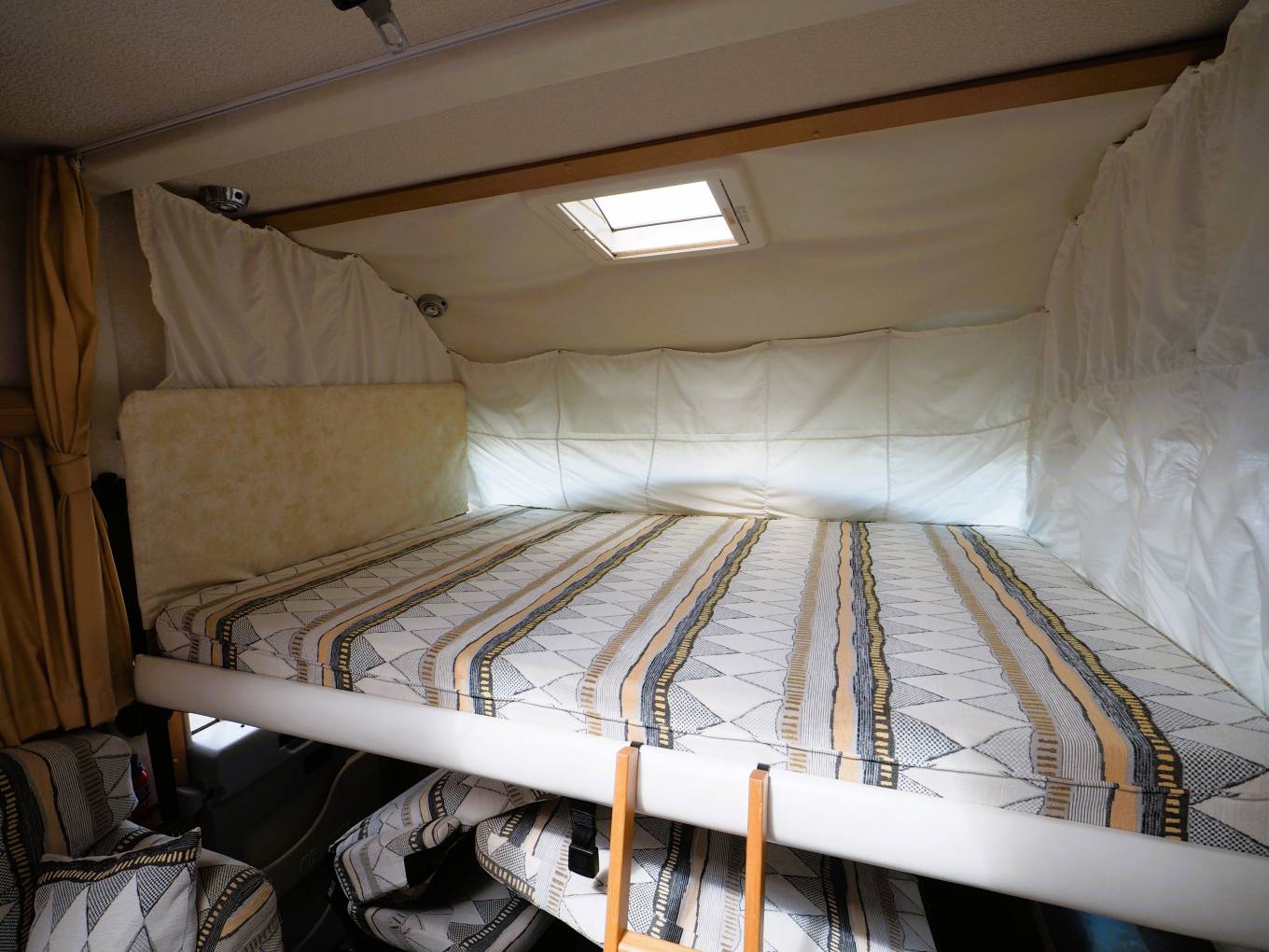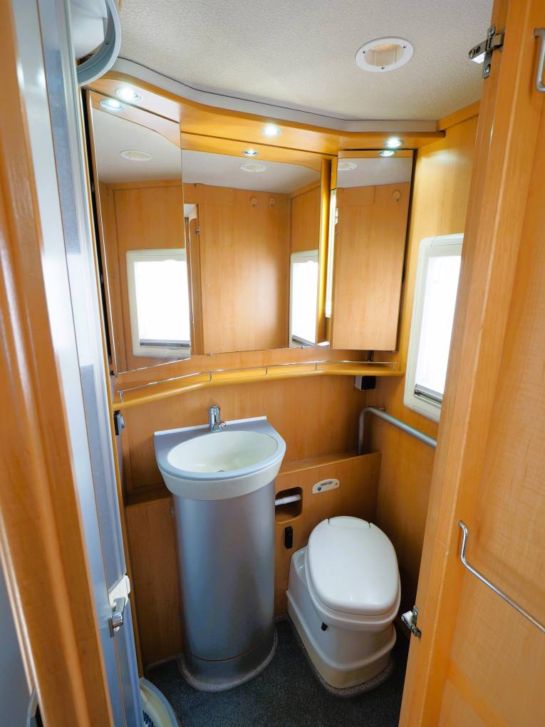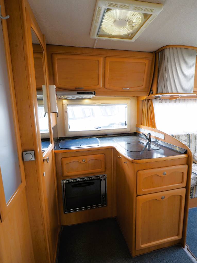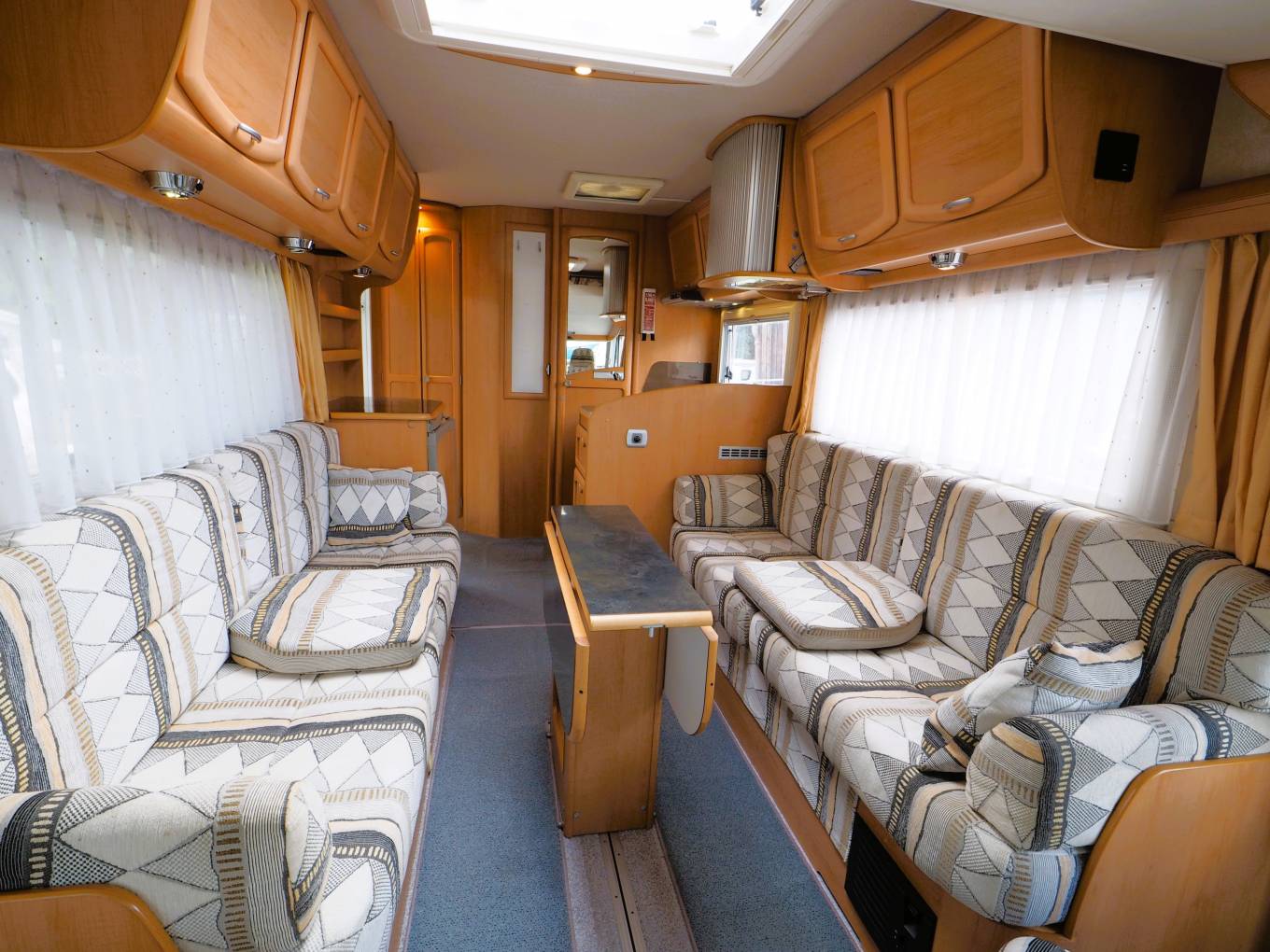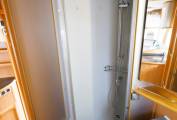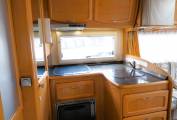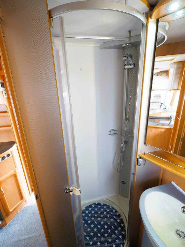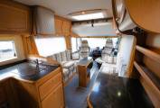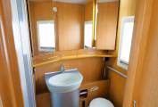 The kitchen has a 3 burner gas hob with extractor, oven, sink with mixer tap and drainer and an undercounter 3-way fridge with freezer box. There is also a Heki reversible fan skylight. Plenty of cupboard and drawer storage with overhead lockers to both sides. Home from home comforts with a spacious washroom with large vanity mirror and built in storage. Flushing cassette toilet, sink with mixer tap and separate shower cubicle. A large wardrobe and shelving sits to the side.