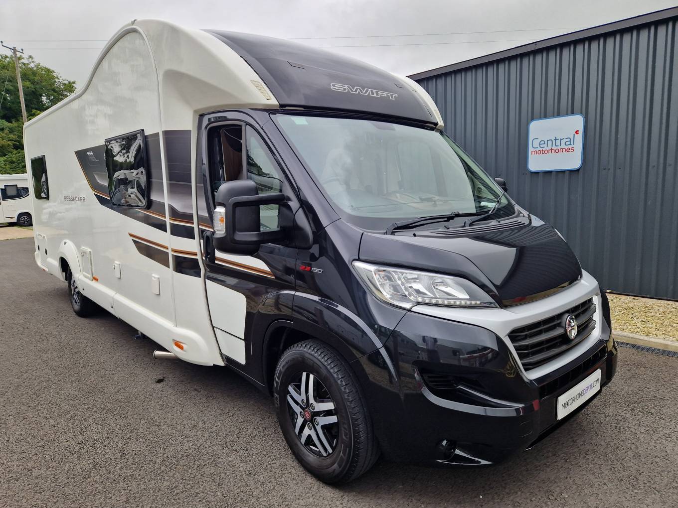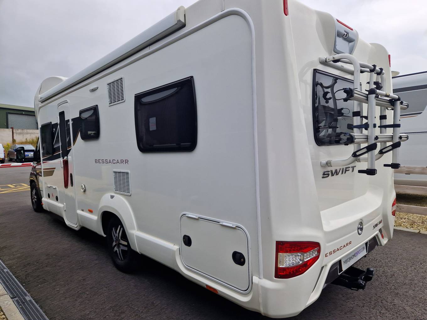 2019 Swift Bessacarr 596 6 berth luxury motorhome for sale. This high specification model has a generous amount of space and will accommodate 6 persons easily with 6 sleeping places and 6 dedicated travel seats. The layout consists of an open rear lounge area, fully equipped mid ship kitchen, washroom with separate shower and a front dinette area with drop down bed. Plenty of storage space is provided with a transverse locker and lower belly locker. Other features include Fiat Ducato 4250kg chassis (C1 license required) alloy wheels, tow bar, reverse camera, awning, bike rack, solar panel, cab shades, cruise control, cab air con and much more. Recent timing belt service and habitation inspection have been completed. Sale includes one years warranty and gas certification. Finance and part exchange available. Please call for further details.