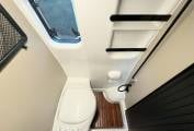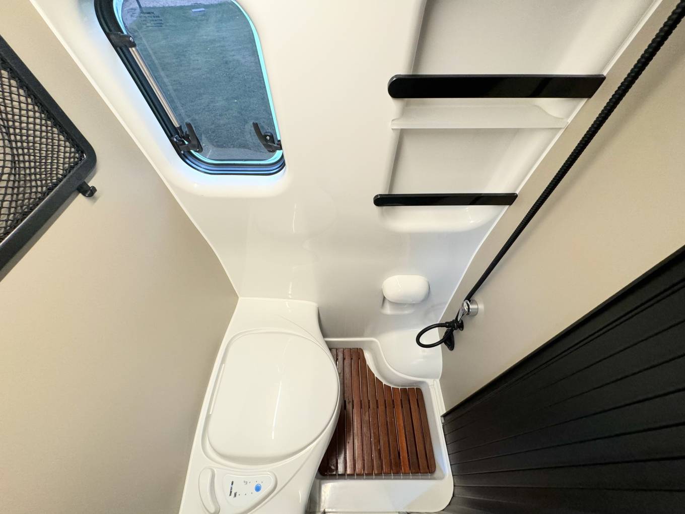 Adjacent to the kitchen sits your washroom this houses a toilet cassette, hand-wash basin and shower.