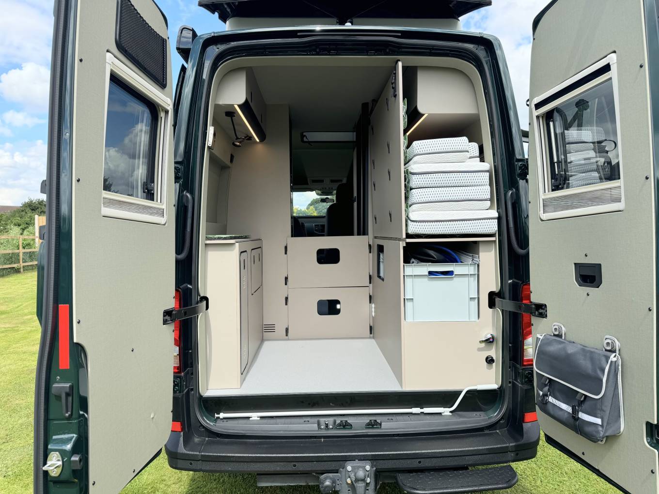 Moving to the rear of the MAN you will see the rear fixed transverse bed, this cleaver design allows you to prop the base of the bed up while travelling allowing you to take everything any anything. The rear bed comes with pop-outs to make up to be 6ft 4in so you won't be struggling for room unless you are in fact 6 ft 5.