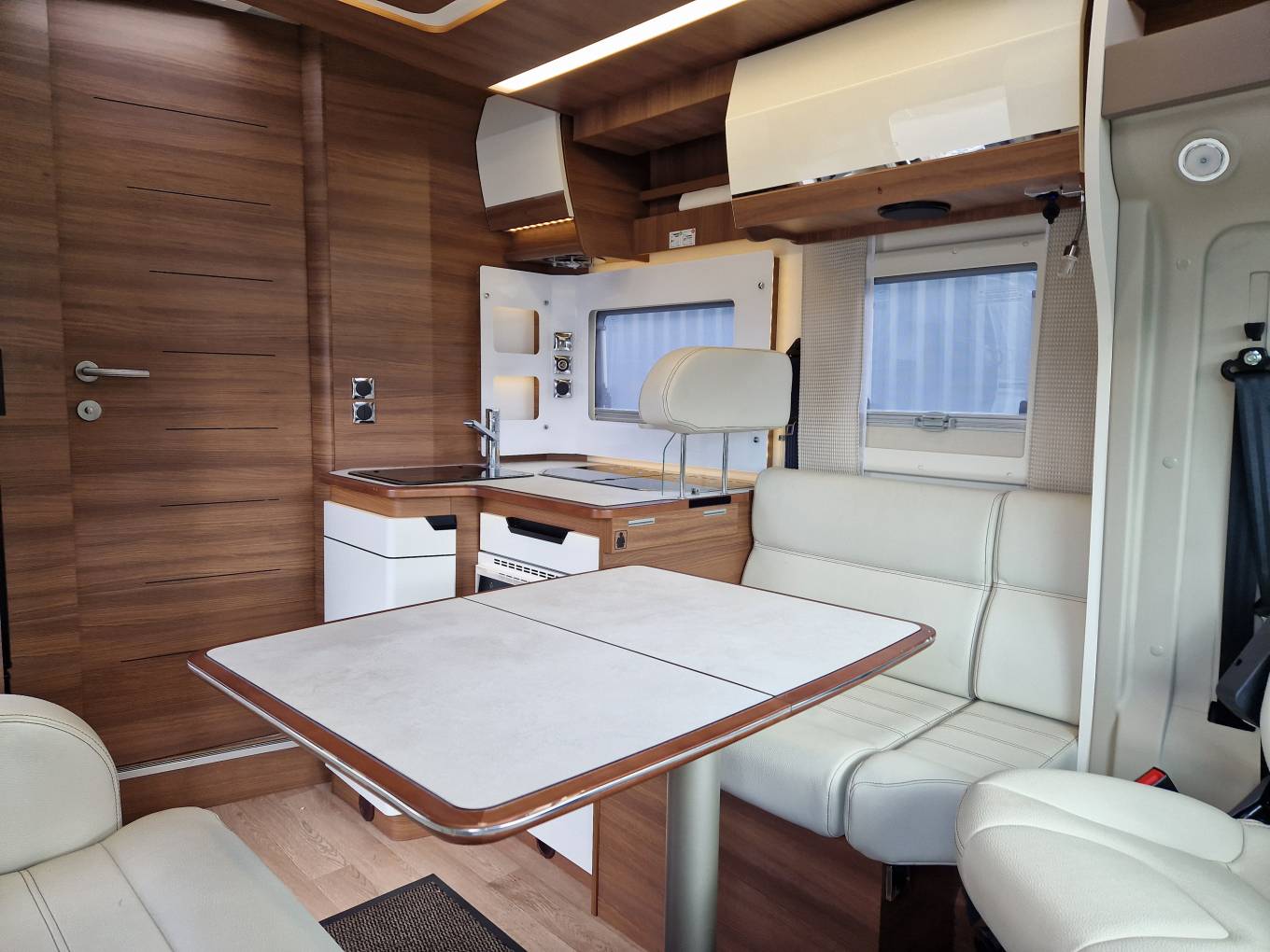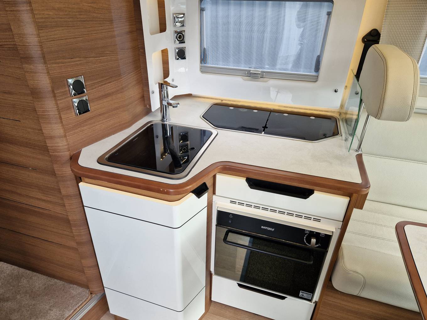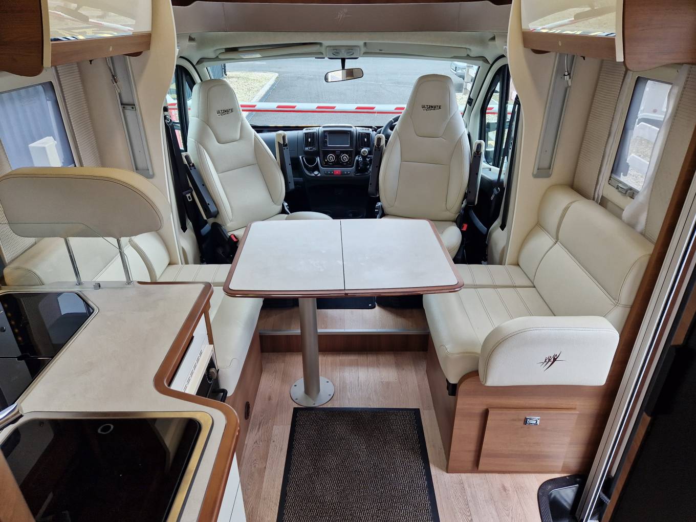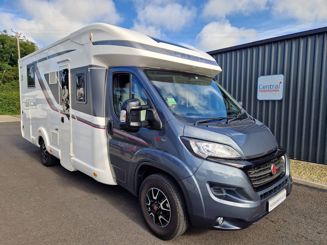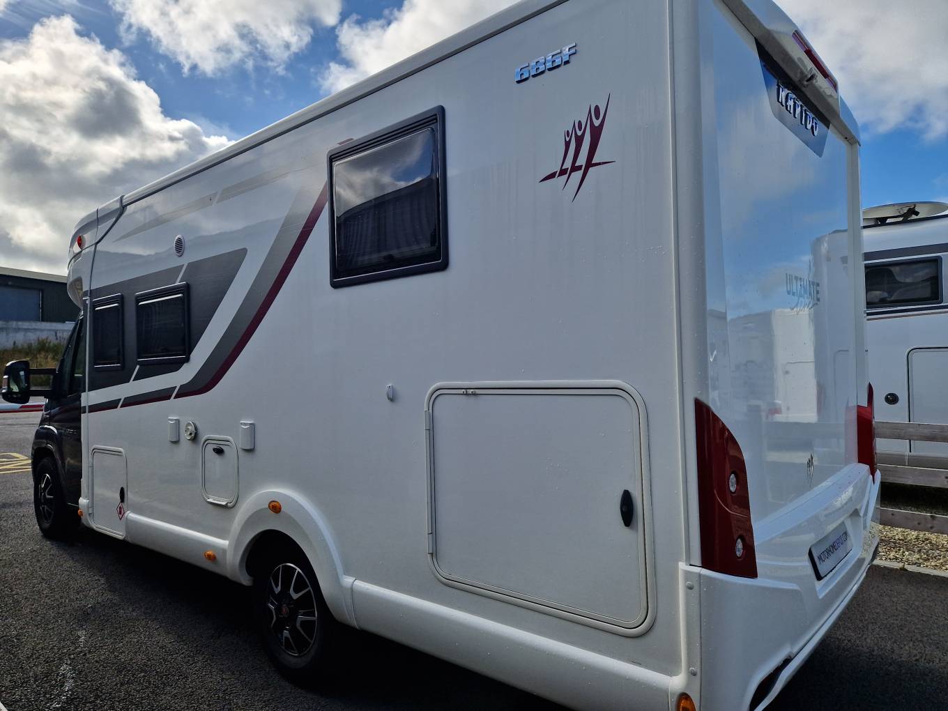 2021 Rapido 686F fixed bed motorhome for sale. The Rapido brand is well renowned for quality and high specification making this 686F model very desirable. Featuring a luxury fixed island bed with en suite washroom and separate shower. The front lounge area features twin swivel chairs, two additional travel seats and a drop down bed for two more sleeping places. A mid ship kitchen is well equipped and includes a large fridge freezer. This layout offers plenty of storage including a large external garage with a height adjustable feature offering enhanced space. Other features include Fiat Ducato 3500kg chassis with an upgraded 2300cc 140hp engine, alloy wheels, reverse camera, colour coded cab, cab air con, cruise control, cab shades and much more. Sale will include gas certification, mechanical service and one years warranty. Finance and part exchange available. Please call for more details.