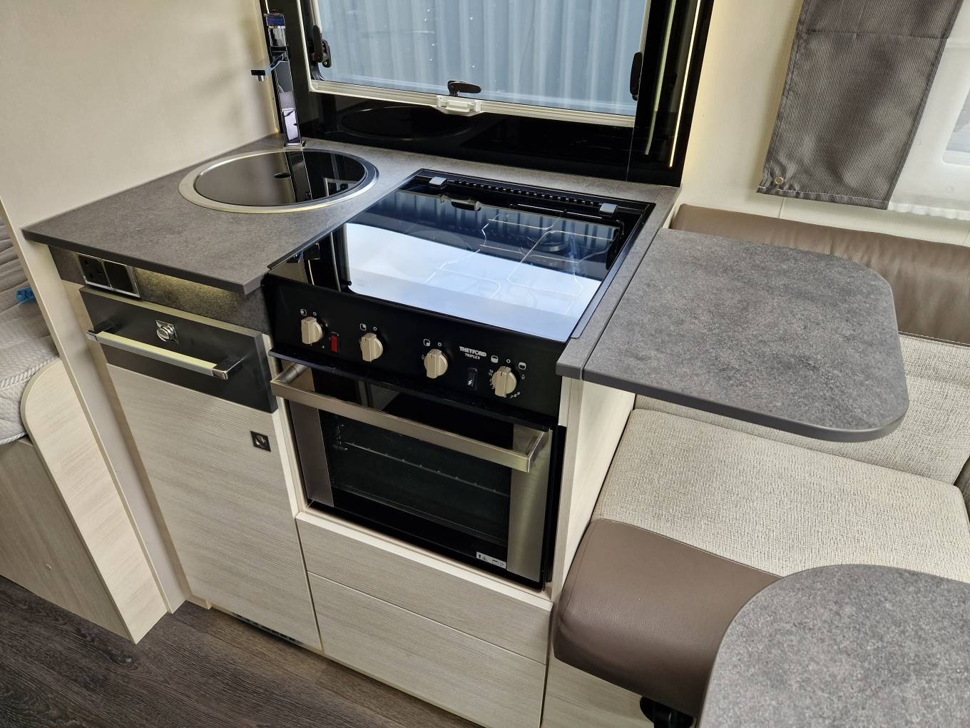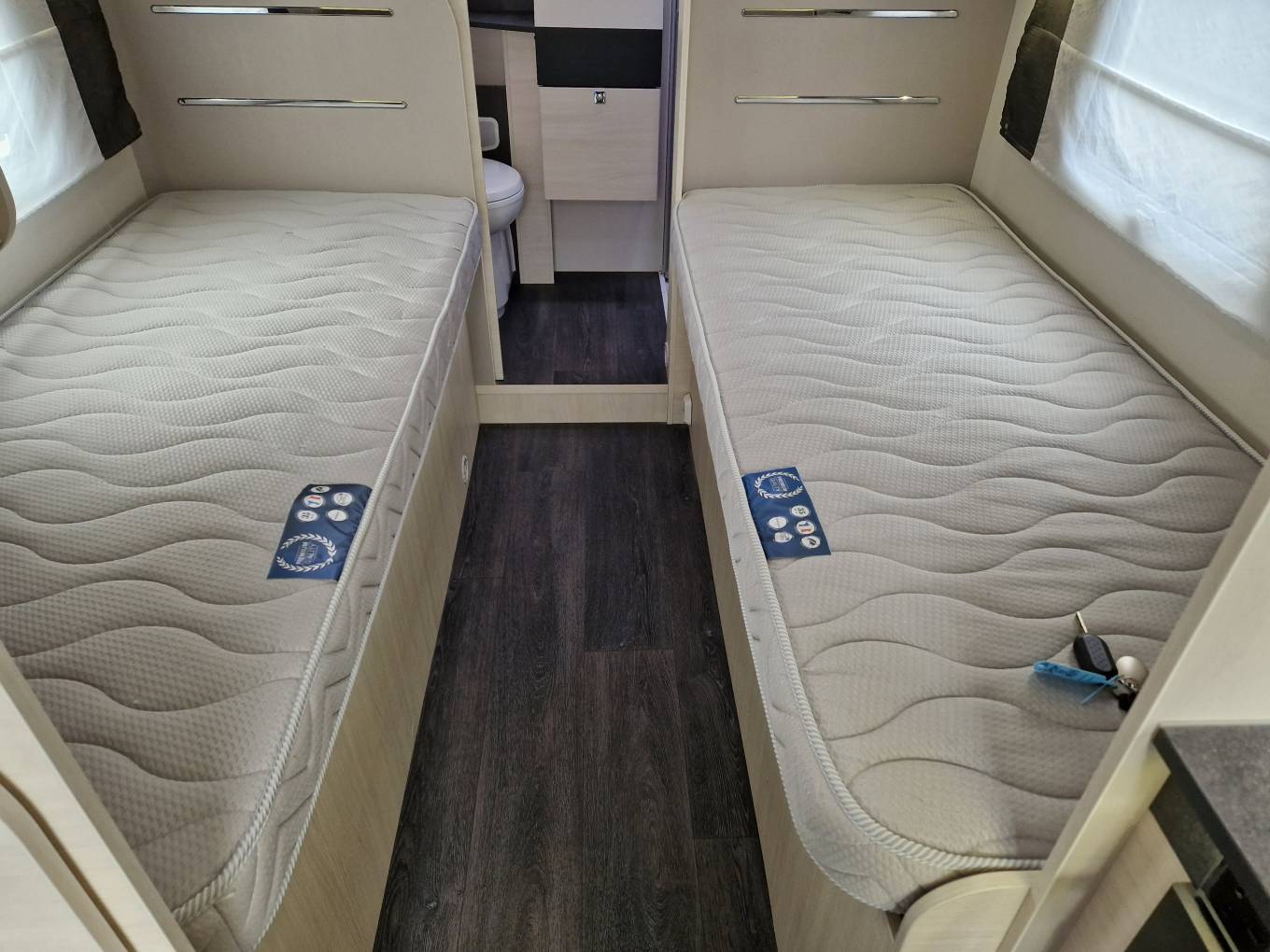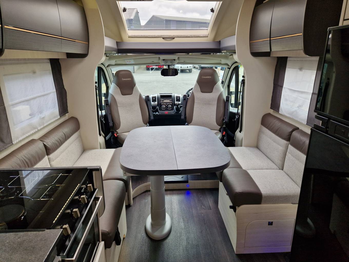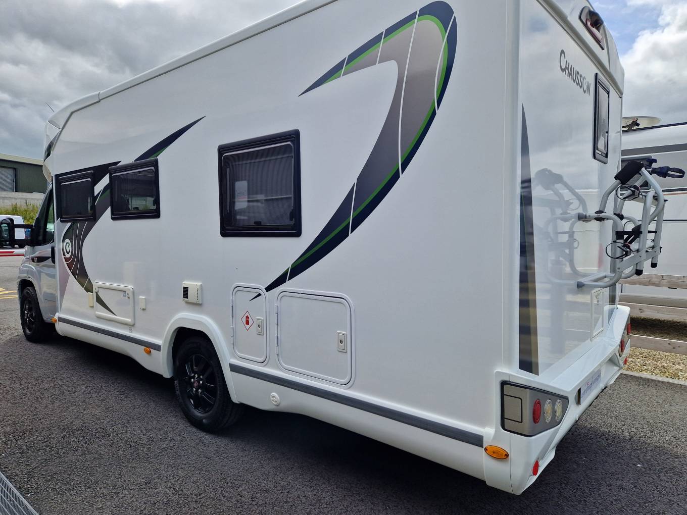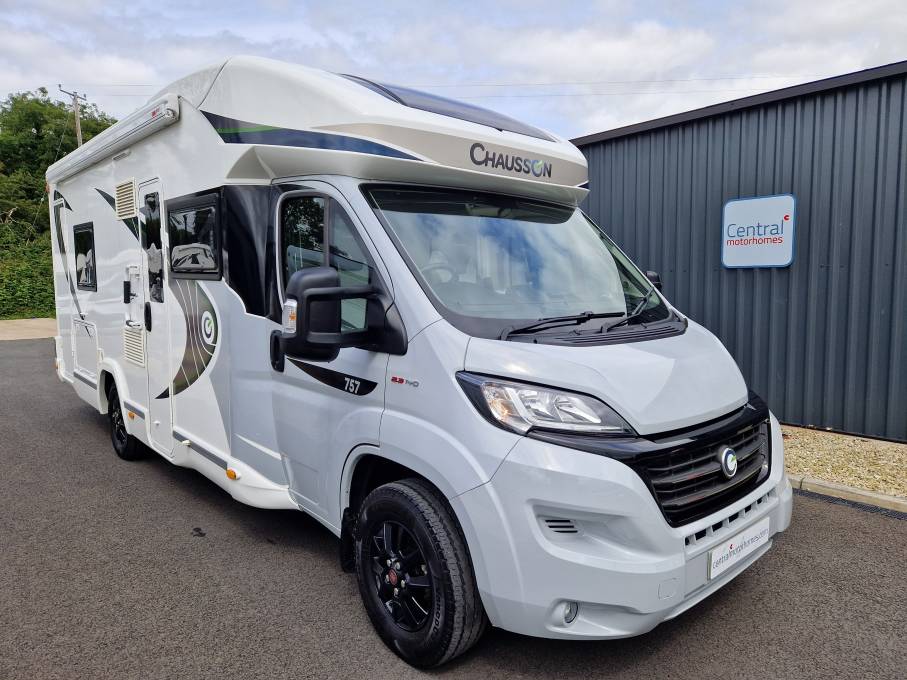 2021 Chausson 757 Premium luxury low profile motorhome for sale. Presented in beautiful condition with low mileage, this Chausson 757 model boasts a huge specification and can be driven on a standard car license. Twin single beds make way for the end washroom with separate shower and a large wardrobe for storage. Further storage is available under the beds as well as an external locker. The front lounge area is open and spacious and features twin swivel chairs, two additional travel seats and a panoramic roof light. Other features include cab air con, cruise control, cab shades, solar panel, reverse camera, bike rack, awning, alloy wheels colour coded cab, external gas and water points, Truma combi heating, aerial, TV and much more. 1 years warranty is included. Finance and part exchange is available. Please call for further details.