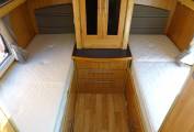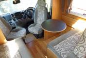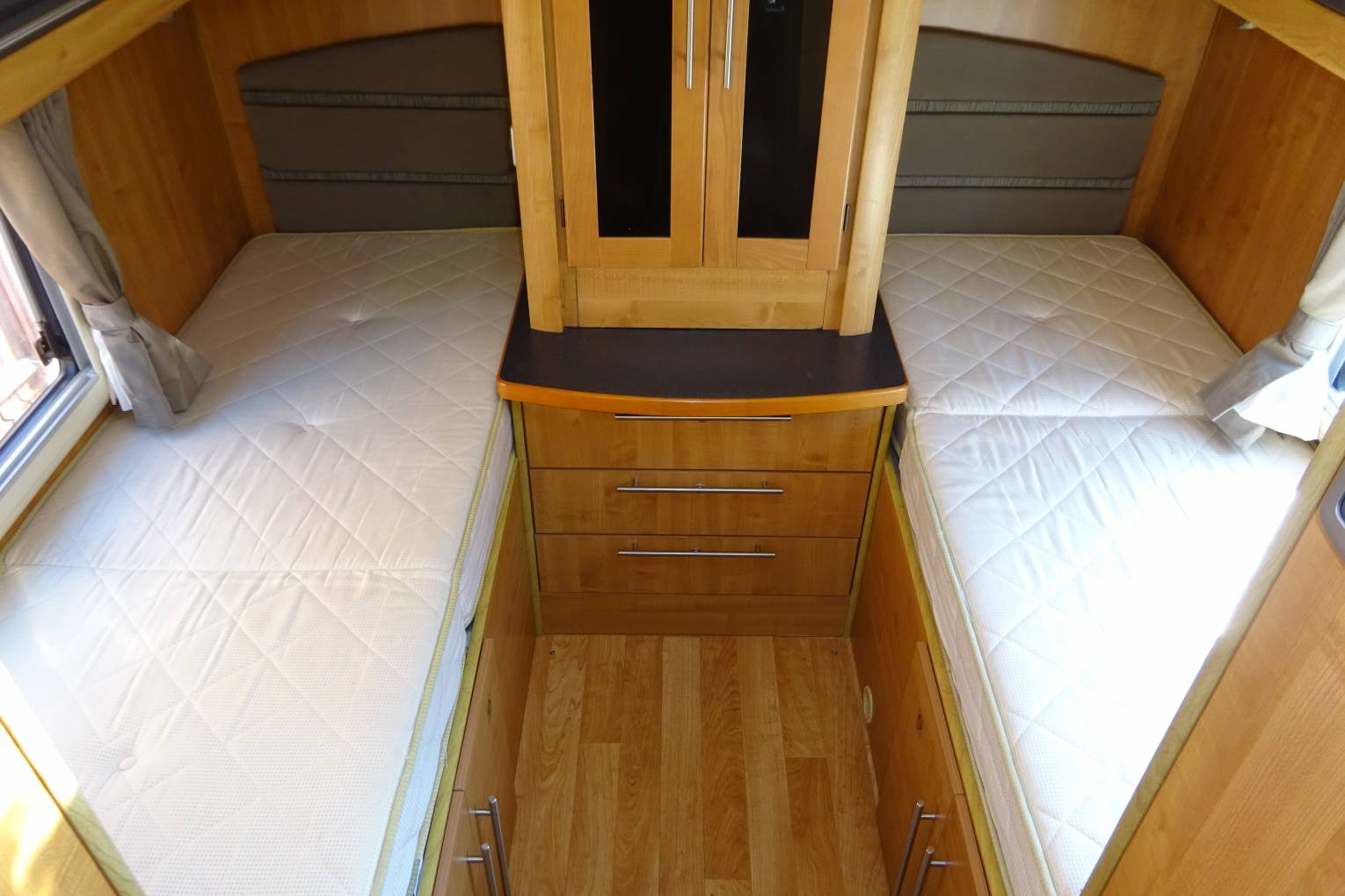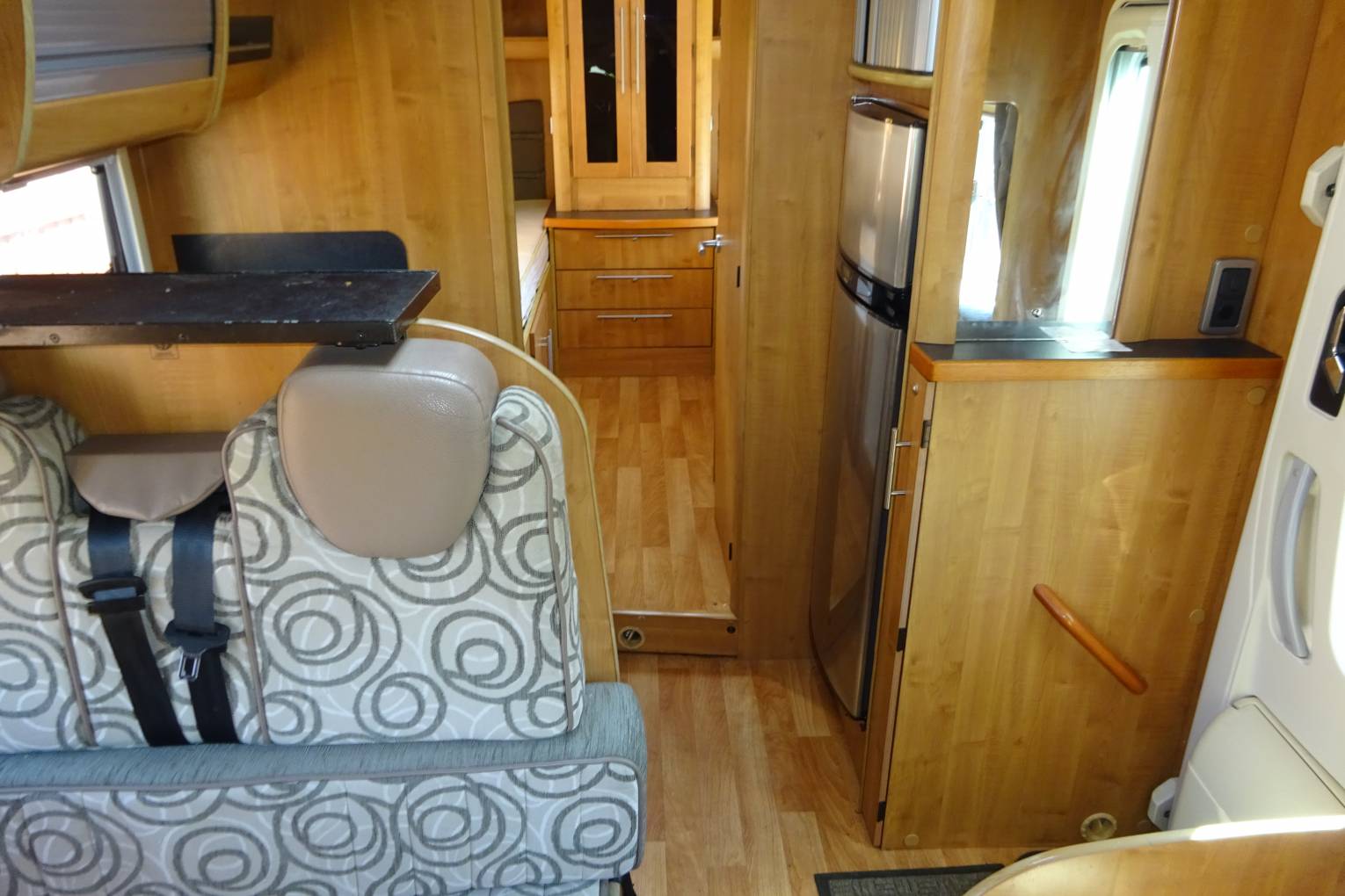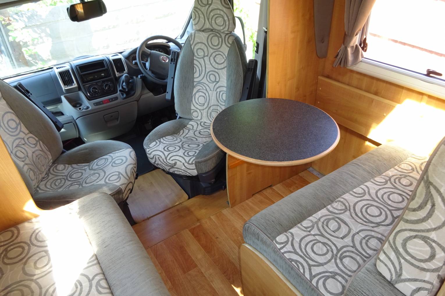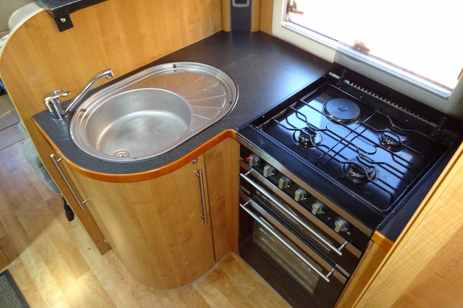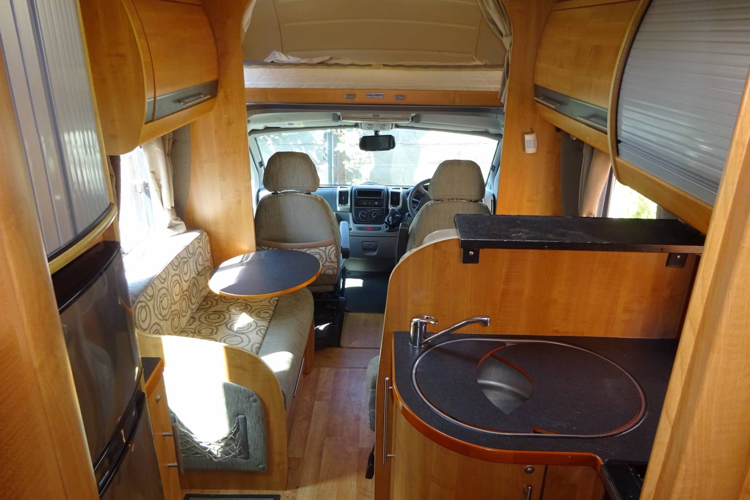 As you step inside the motorhome you get a real feel for the condition of the Motorhome with a light, warm, airy feel. The two captains chairs and settees making for a comfortable living area with a choice of a large table or a couple of smaller round tables. The kitchen is fitted with a 3 burner gas hob with a 4th electric ring, oven, sink, microwave, and a fridge freezer that allows for all your cooking needs. Behind the kitchenette is the bathroom fitted with toilet, basin and a vanity unit on one side and a separate shower cubicle opposite. At the rear of the motorhome you find fixed single beds with a second large double over the cab. There is ample storage throughout the living area, kitchen and bathroom for all your needs including under bed storage and a large garage accessible from the inside and out. It also has the added benefit of a satellite tv system.