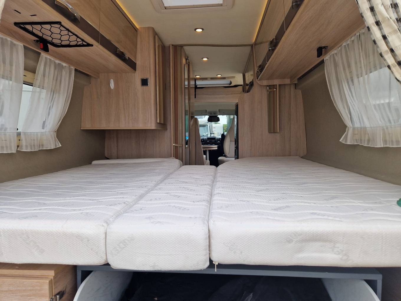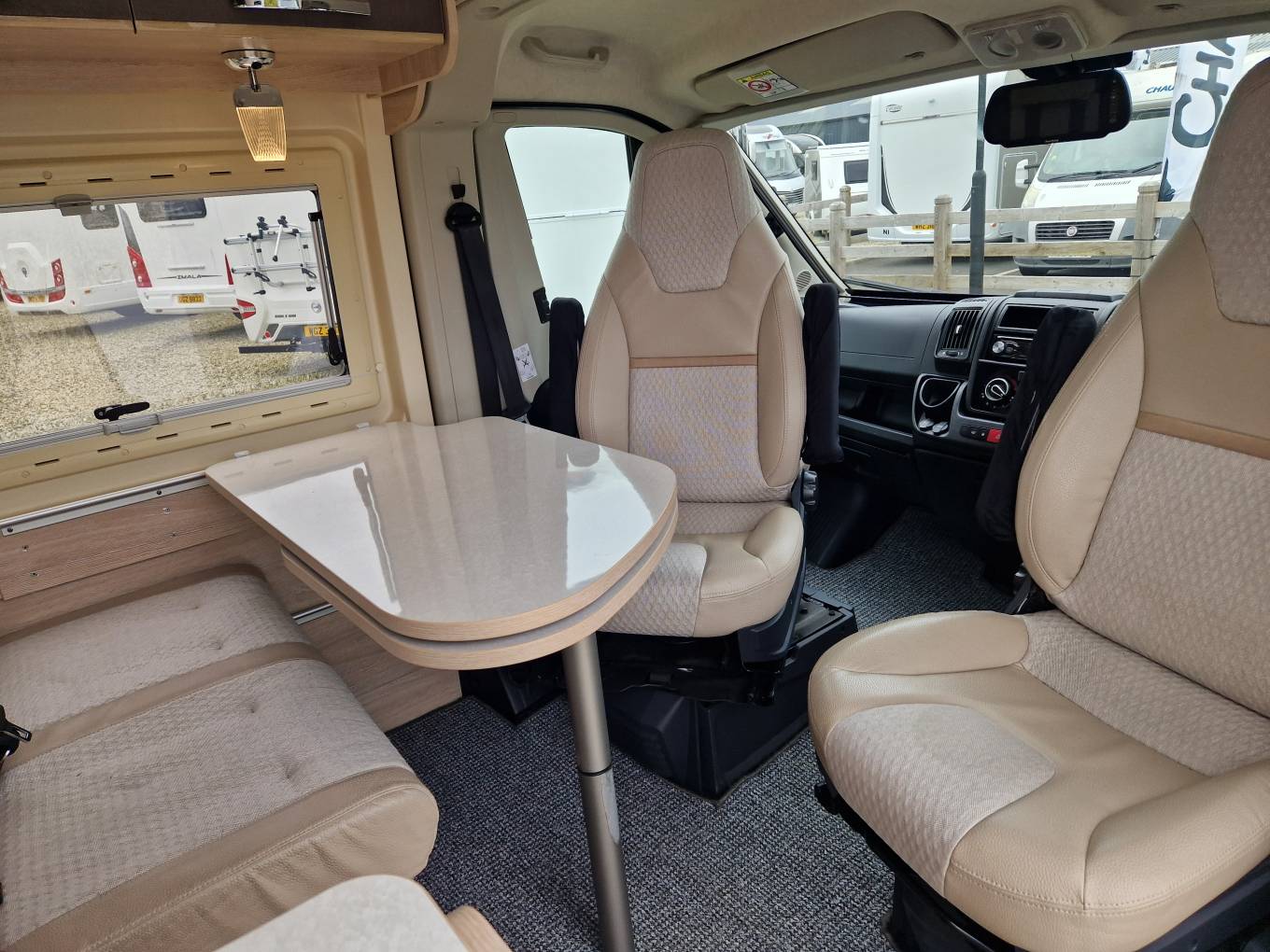 2017 Rapido V68 Camper for sale. This popular layout is well proven and this model is presented in nice condition throughout. The specification includes a Fiat Ducato 3500kg chassis with a 2300cc engine, rear twin beds with storage beneath, mid ship kitchen and washroom and a front half dinette with twin swivel chairs and extendable table. Other features include colour coded body, alloy wheels, tow bar, reverse camera, rear air suspension, awning, electric step, TV & aerial, cab shades, cruise control, cab air con, truma heating, solar panel and much more. Sale includes one years warranty. Finance and part exchange available. Please call for further details.