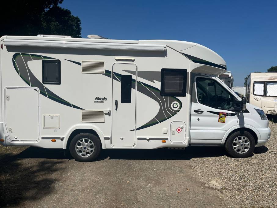 This is an outstanding example of the super Chausson Flash 610 Special. This 4 berth, 4 seatbelt model features the electric drop down bed, spacious front dinette, centre kitchen with large rear bathroom. At only 6.7 metres long, this van is small enough to use but big enough to enjoy and was originally plated at 3500kgs but has been upgraded to 4000kgs so the new owner will have the choice which the current owner is happy to facilitate. A great design with Chaussons great build quality. Based on the excellent Ford Transit chassis with the 170 bhp and a 6 speed manual gearbox. Full service history on the Ford and full habitation history on the Chausson with the supplying dealer. Not to be missed. This example includes an Awning, reverse camera, towbar, alloys, 160 watt solar, gaslo refillable bottles, cat 1 alarm, tv, aerial and a external silver screen thermal blind. 22,600 miles and based in Kent. More pictures available.