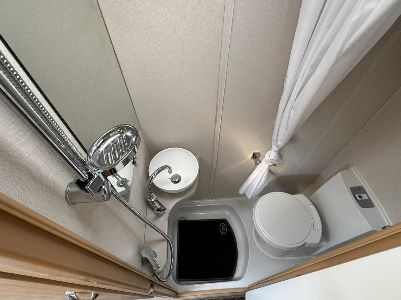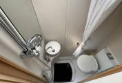 Directly above the cab and main habitation are skylights that let in tonnes of natural light. Toward the rear is a main wardrobe space and rear washroom with a shower tray, cassette toilet, sink, mirror, cup holders, waterproof curtain and storage space. Also at the rear is a kitchen area with a full oven unit including 3 gas hobs, a mains powered hot plate, a grill and an oven. A 3-way manual fridge and freezer, a sink, worktop space, microwave, plenty of storage and 3-pin mains powered sockets.