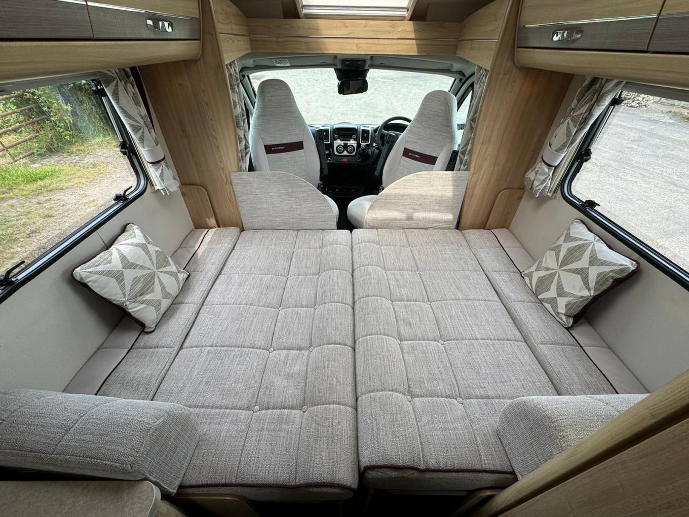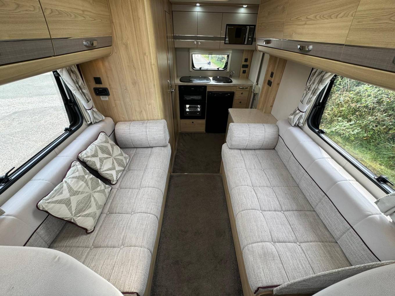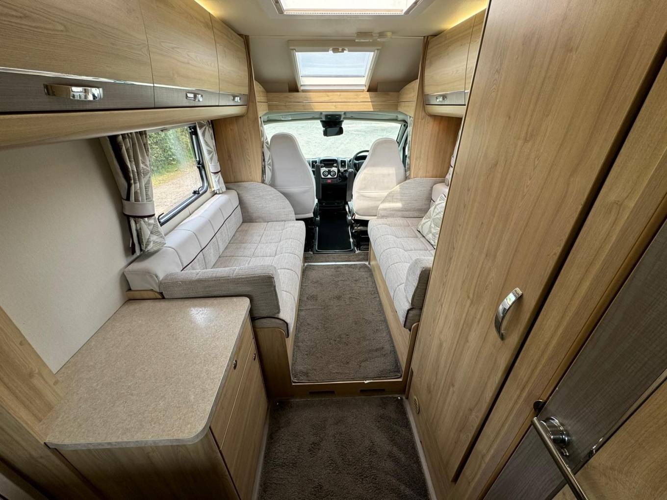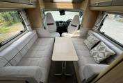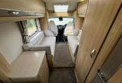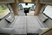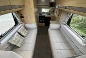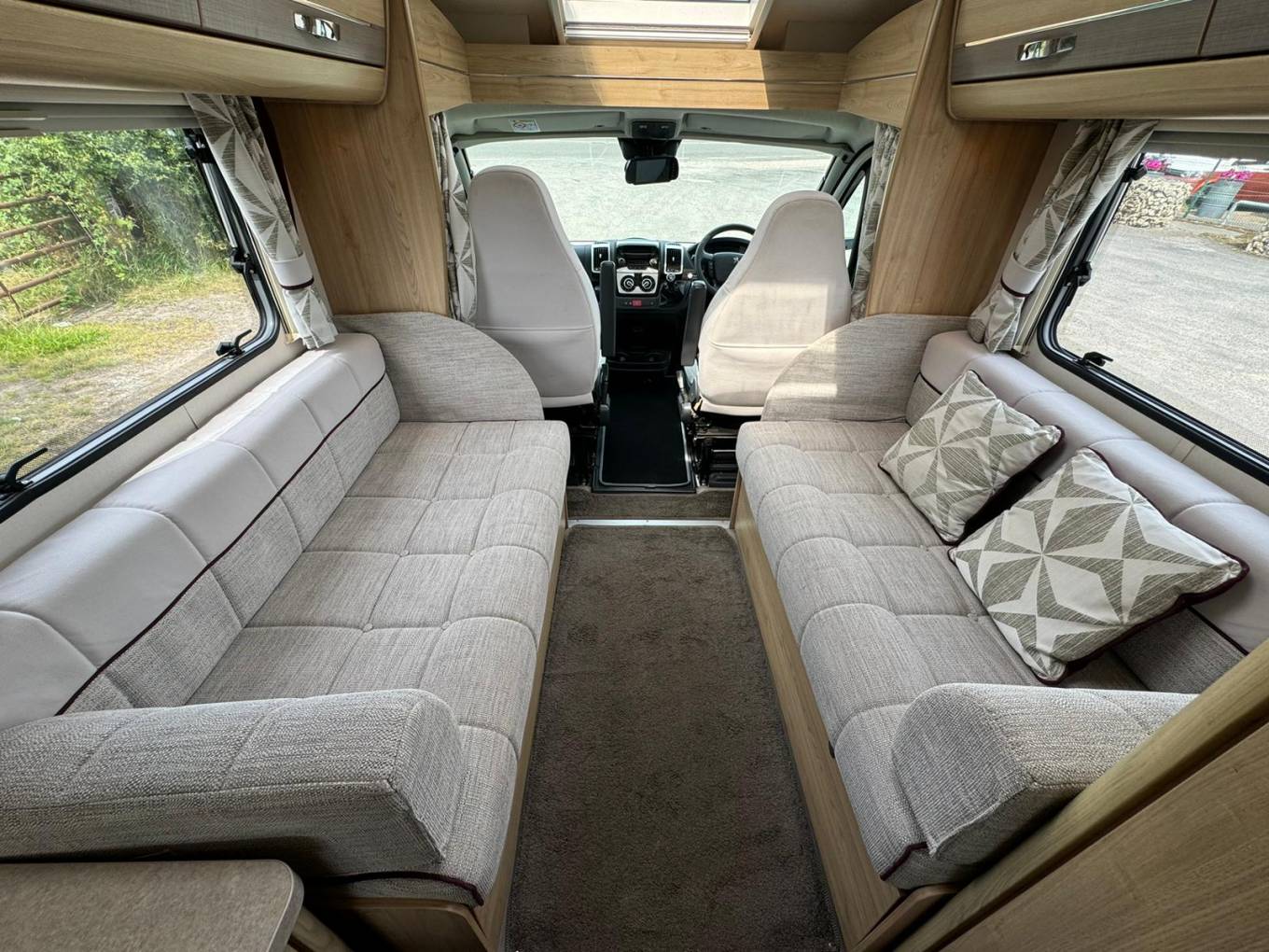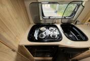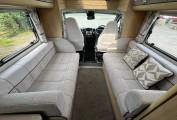 Compact and spacious 2 berth Elddis, featuring communal bench seats that easily convert into a sleeping space, along side allowing enough room for a stow away dinette to be used when dining. There are 2 captain swivel travel seats in the cab, alongside a 6-speed manual gear box, central locking, cab AC, a standard radio system with media, Bluetooth, menus controls and more. There are 12V cigarette lighter and USB ports, alongside menu navigation controls on the steering wheel.
