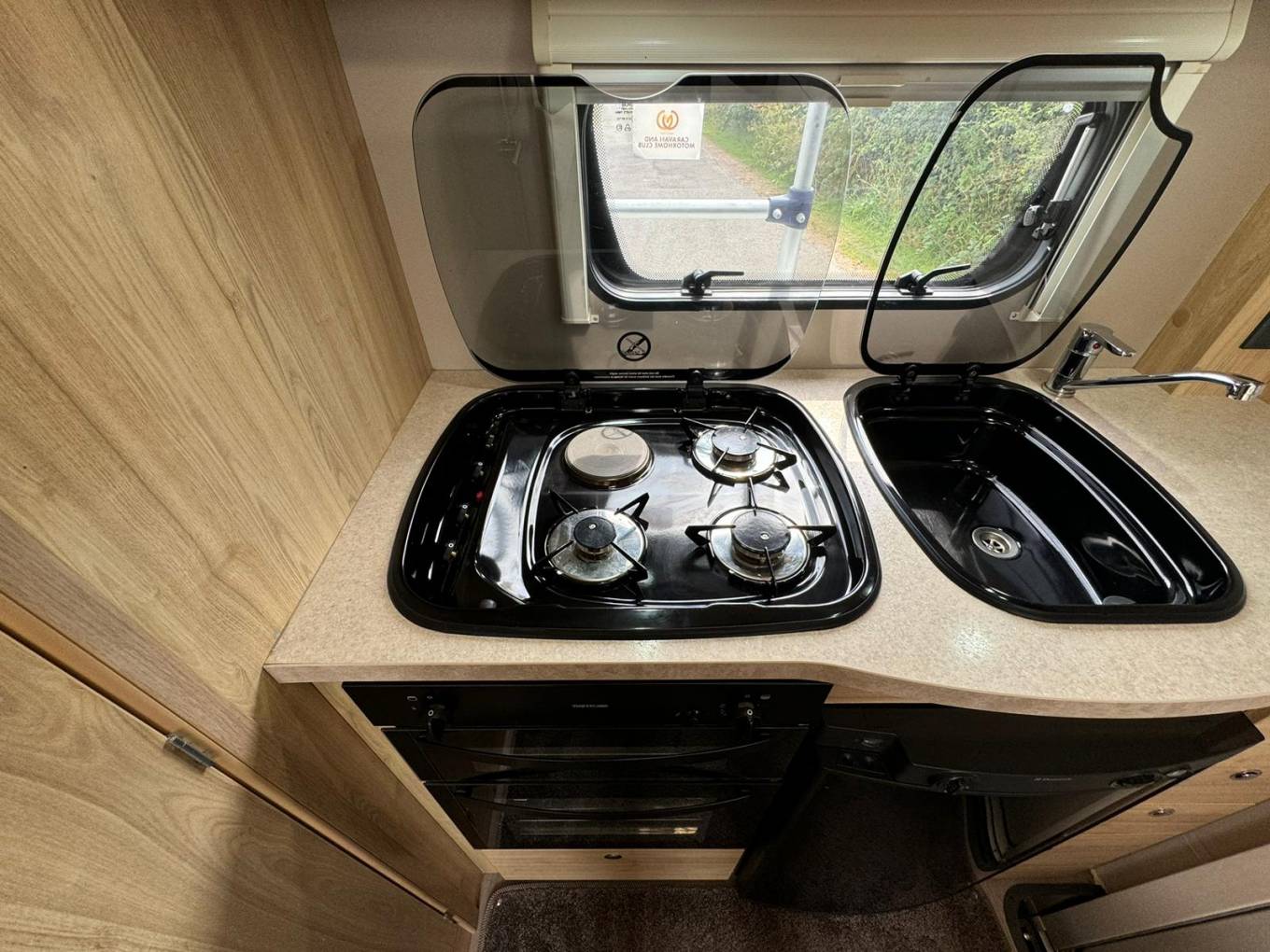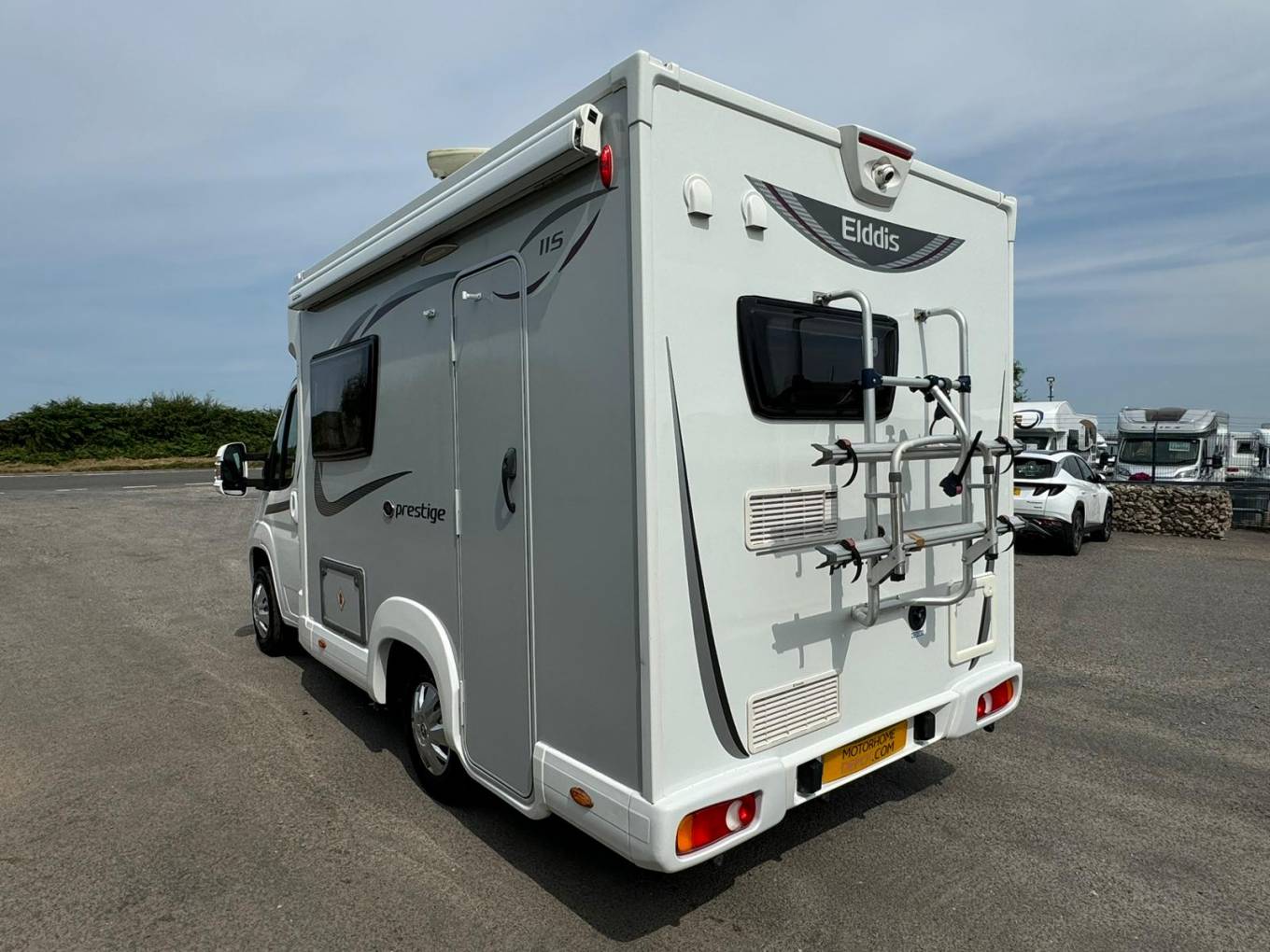 These sockets can also be found throughout the habitation in conveniently located places. A simple and easy to use Elddis master panel has been selected, with mains isolation, awning, lights, water pump and tank heat options, alongside energy level reading display. The Prestige 115 features a whale hot water and heating system that can be used on electric and gas, with a very simple to use panel for its operations. External features; ventilation, wind out canopy awning, canopy light, gas outlet, fresh and waste drains, twin gas locker, fresh water filler point, mains inlet, bike rack, cassette locker.