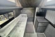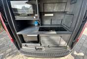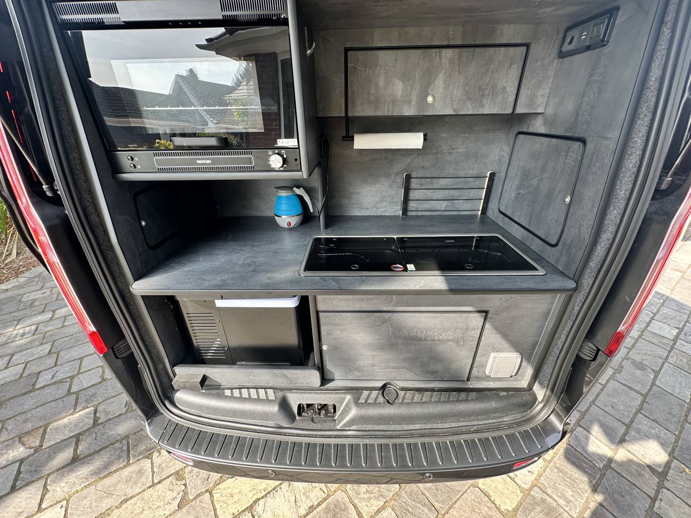 In the well finished habitation area you will find a large, comfortable sofa and removable table, which when utilising the front 2 swivel captain seats can easily seat 4 for dining. As the night draws in this conveniently converts into a practical double bed. There is a TV to provide entertainment when relaxing and on those typical English rainy days. The curtains around the Campervan provide ample privacy. Lighting is also fitted throughout, although the windows and canvas pop top allow a generous amount of natural light through the daytime. The canvas pop top sleeps 2 and is easily manoeuvrable on the gas struts so allows even the tallest individual to move around with ease whilst the upper bed is raised. There is a generous amount of storage including a large wardrobe, cupboard space and under bed storage, the Porta Potti is cleverly stored away in one of these. At the back you will find the well equipped kitchen including oven and grill, pull out Bluetooth fridge/freezer, sink with mixer tap and 2 ring gas hob. This ingenious design allows alfresco cooking under the tailgate and keeps the van free from unwanted odours.