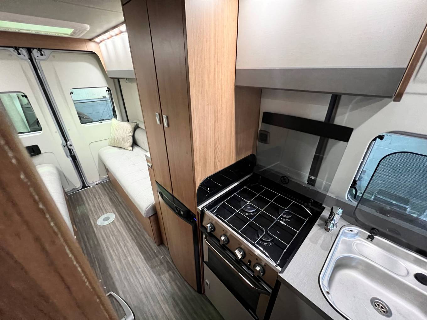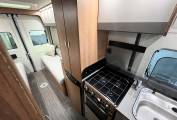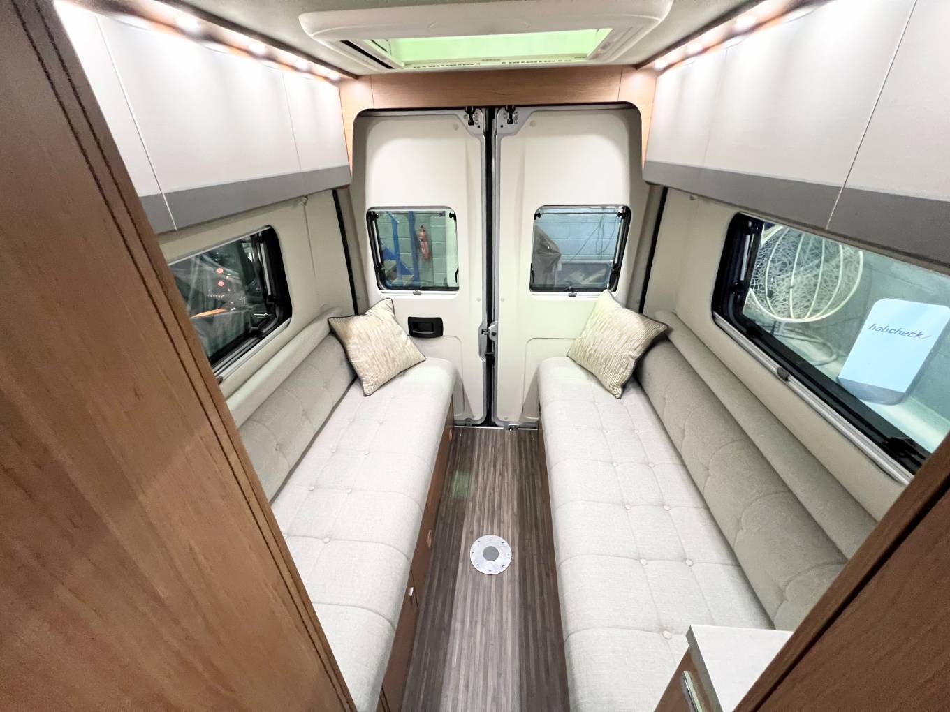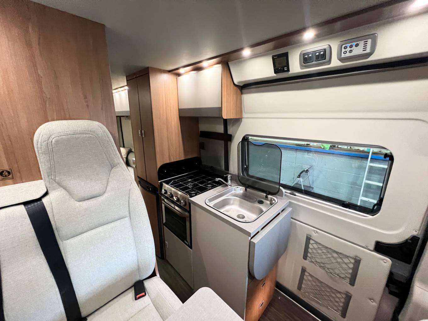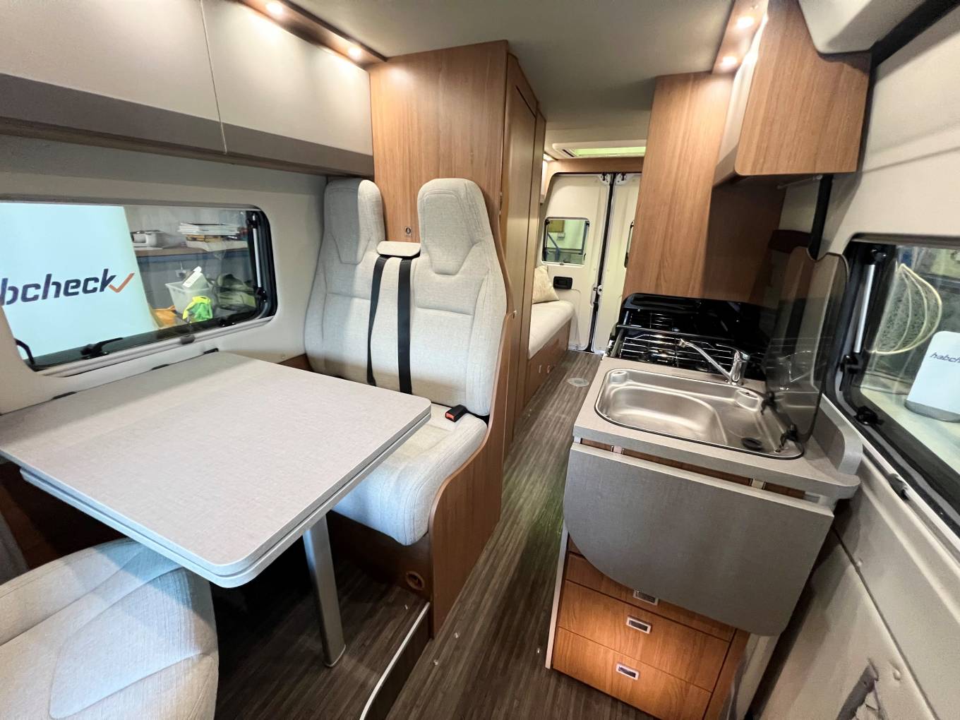 Entering through the side door we have a half dinette area which features two travel seats and can accommodate two for dining by utilizing the two swivel captains seats and extendable table this area also creates a single sleeping area. Moving backwards we have a kitchen which features a sink and unusually for a vehicle of this size a small cooker with 3 gas burners and combination oven and grill. There is also a generous fridge with ice box. Opposite the kitchen we have the washroom which again is well proportioned for a vehicle of this size and maximizes space by using a foldaway sink, there is also a cassette toilet and shower. At the very rear of the vehicle we have a large lounge with standalone table, this also creates a large sleeping area.