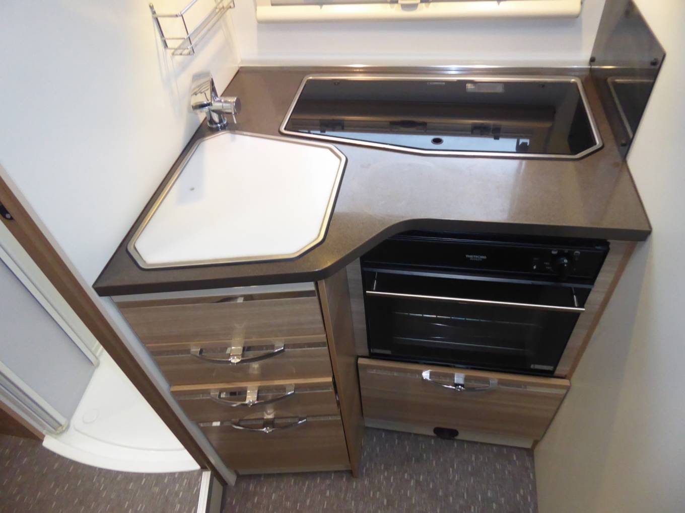 The conveniently adjacent central kitchen is comprised of an nearside sink, a hob with three gas burners, and a combination oven/grill, while a fridge and a separate freezer are located opposite.