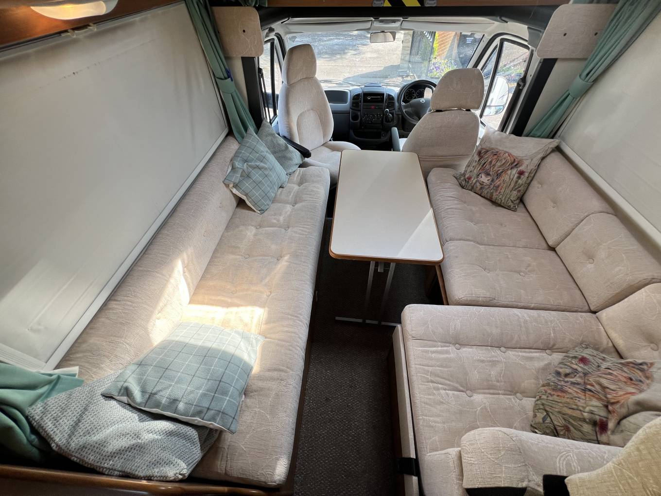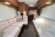 The centre of this motorhome features a roomy lounge area where two inward facing settees are complemented by a swivelling Cab passenger seat.