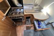 Here you will find a Four Gas Burner Hob, a Grill, a Sink with a Hot and Cold Mixer Tap and Drainer, a Three Energy Source Dometic Fridge and plenty of cupboard space.