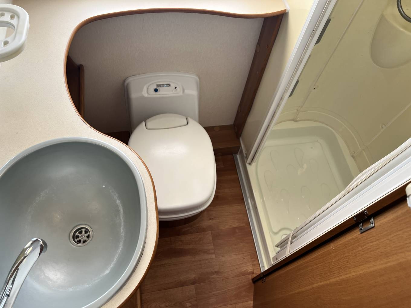 In the opposite corner is the fully equipped bathroom consisting of a Thetford Flush Cassette Toilet, a Wash Handbasin, a separate Shower Cubicle and plenty of cupboards.