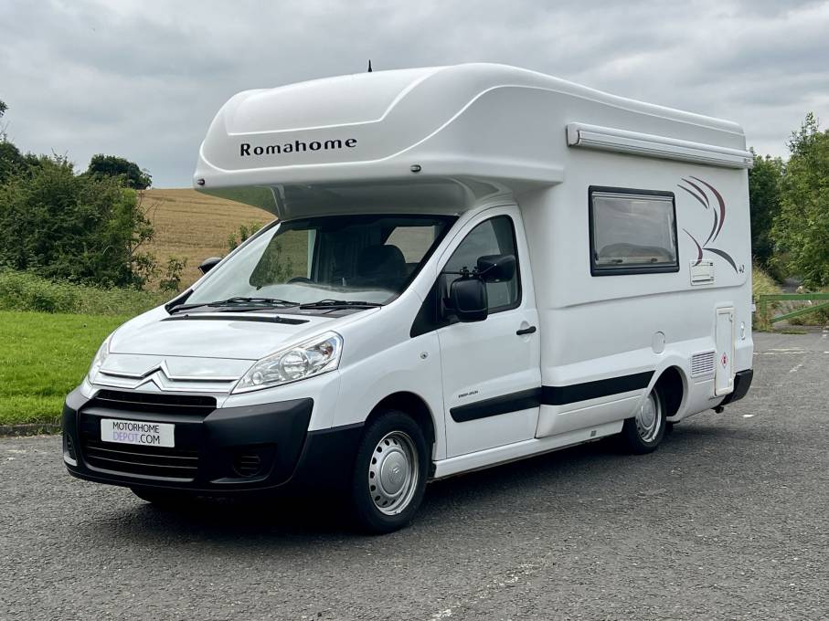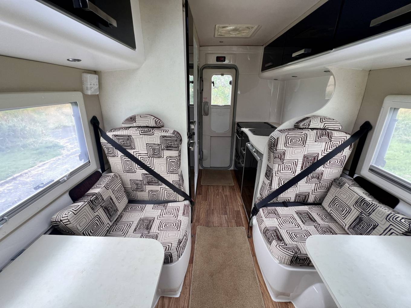 Rare monocoque body 4 berth motorhome from Romahome, known best for their popular compact 2 berth models with rear entrance door. The R40 stretches the concept, literally, even though the body length is a managable 5.7 metres. Its stylish inside, with moulded locker and seat furniture, complimented by coffee coloured upholstery.