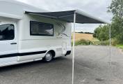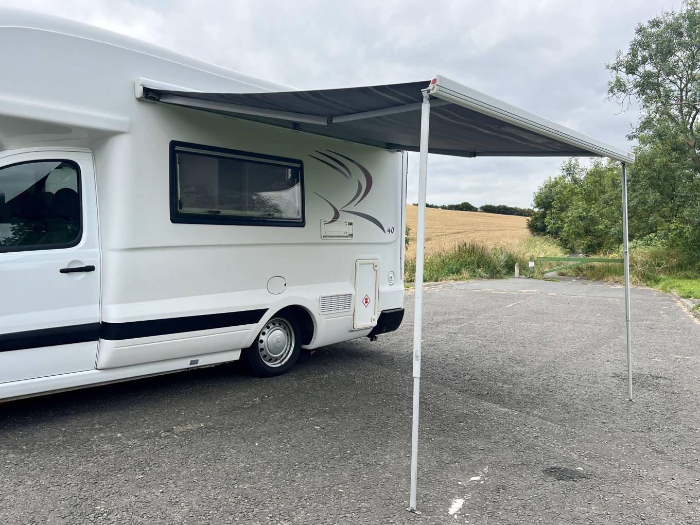 Outside, you will find a roll out sun canopy awning, gas bottle compartment with two bottles included in the sale, Fiamma security bar on the habitation door.